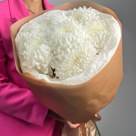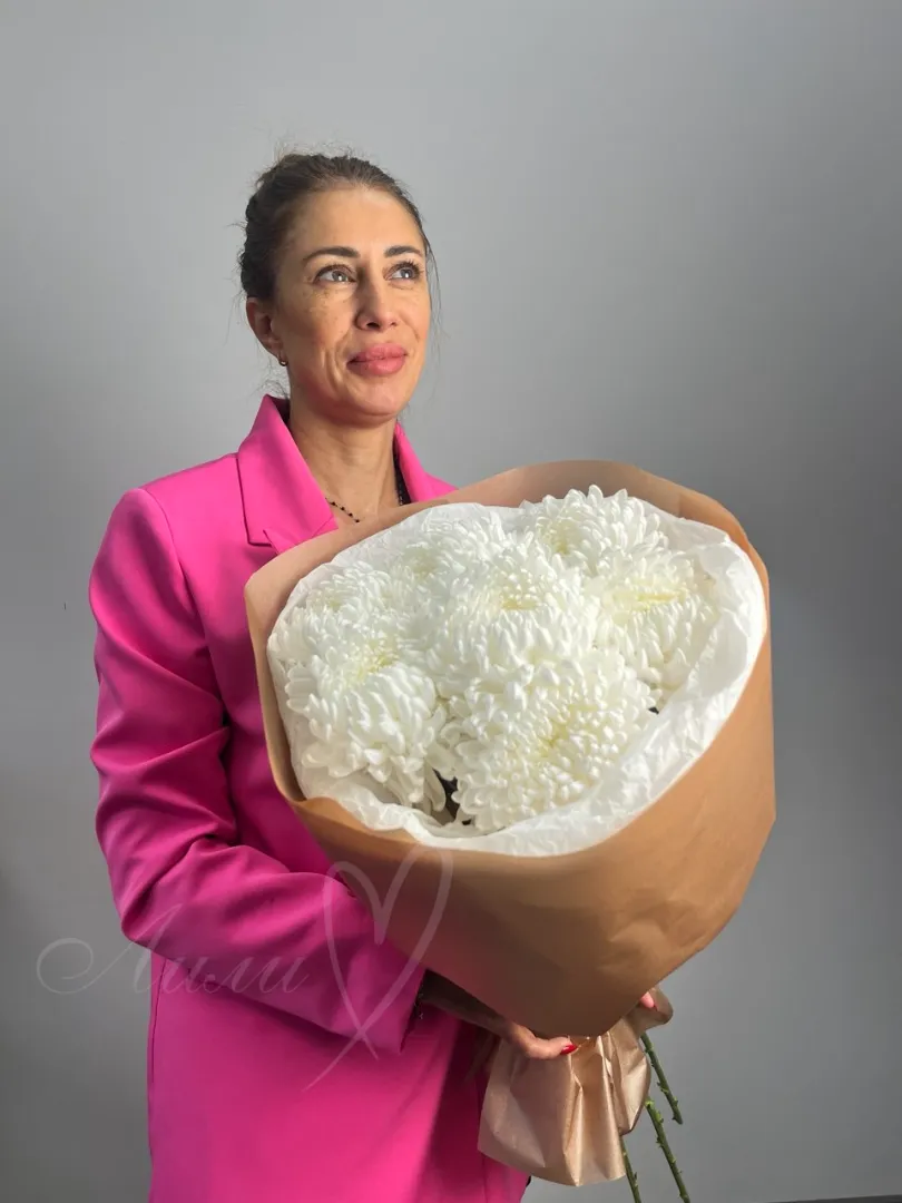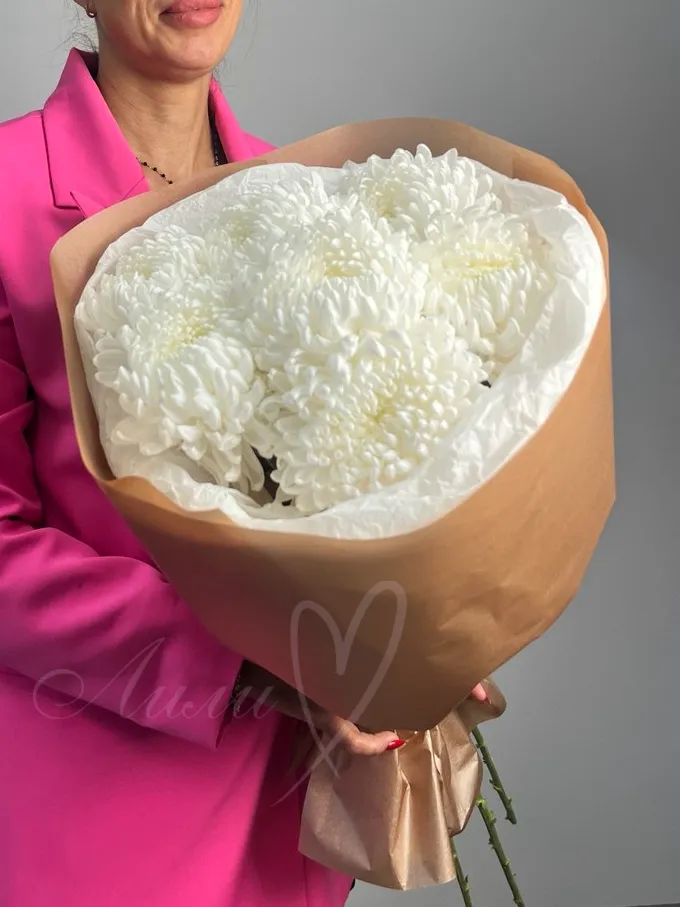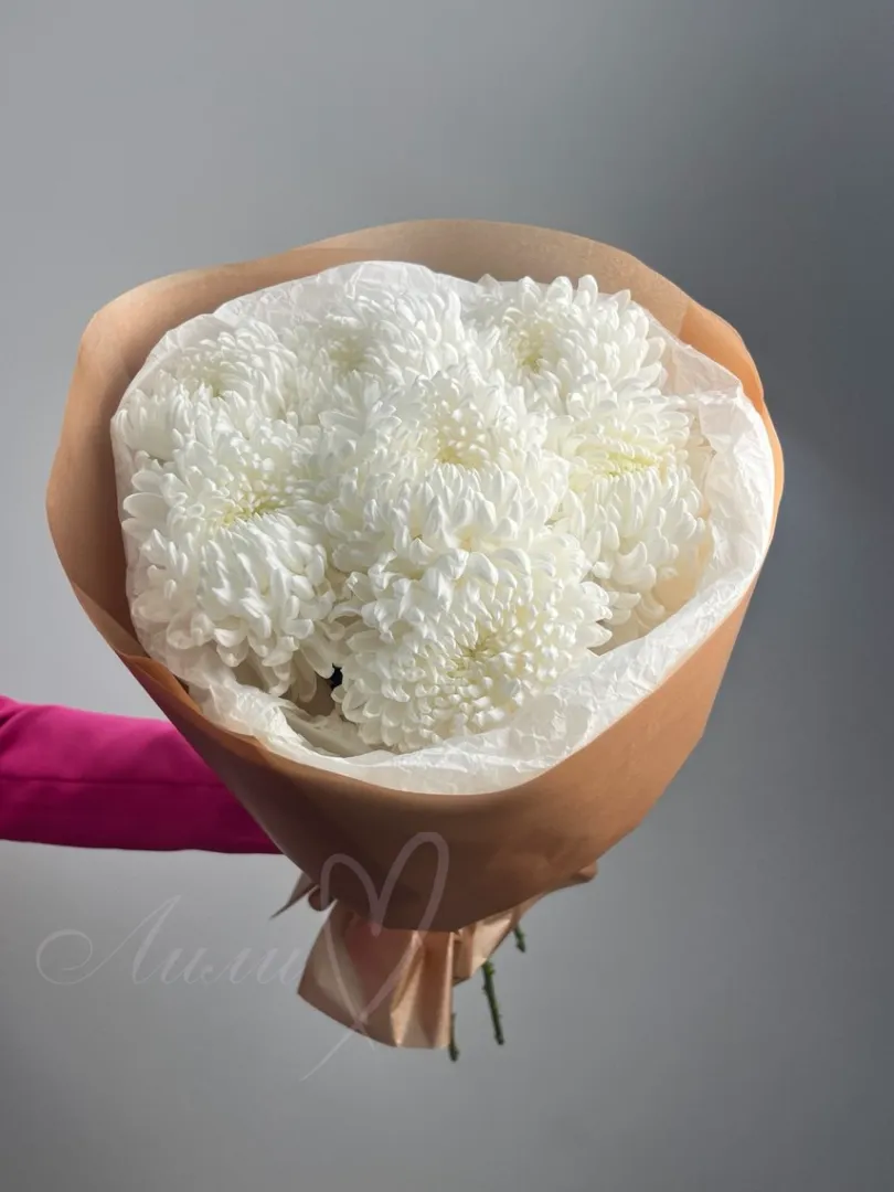 Нежный и стильный букет, состоящий из хризантем, упакованный в корейскую бумагу. Этот букет отлично подойдет как подарок для любого повода . Хризантемы символизируют долголетие, процветание и радость, делая этот букет идеальным выбором для выражения поздравлений и пожеланий.