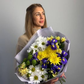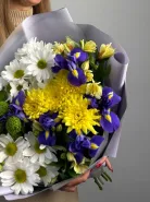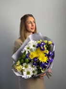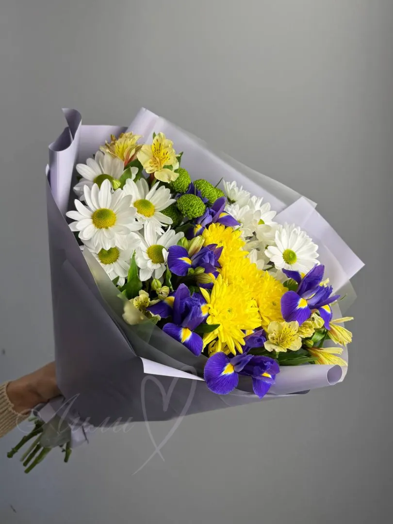 Нежный трендовый букет с ирисом, хризантемой и альстромерией.