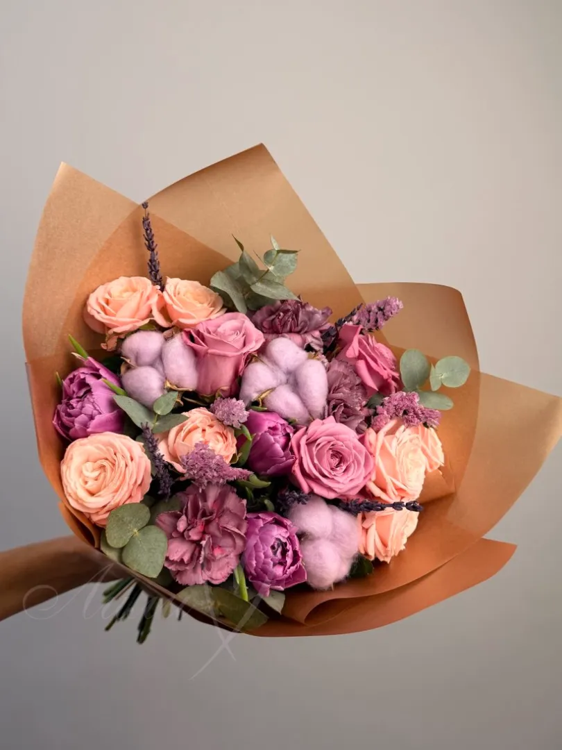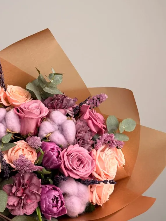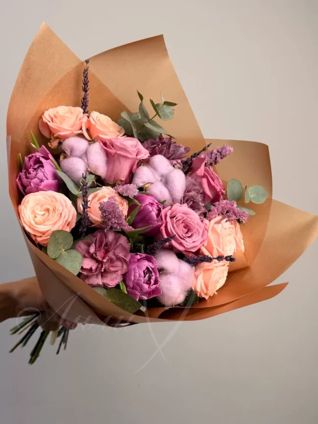 Букет «Адела» — это изысканное сочетание ярких и нежных оттенков, которое подчеркнет особенность любого повода. В его составе гармонично переплелись тюльпаны, кустовые розы и воздушные гвоздики, создавая богатую текстуру и насыщенность. Добавление хлопка и эвкалипта придает букету натуральность и свежесть, делая его по-настоящему уникальным. Закажите «Адела» сейчас и порадуйте близких красивым и элегантным подарком.