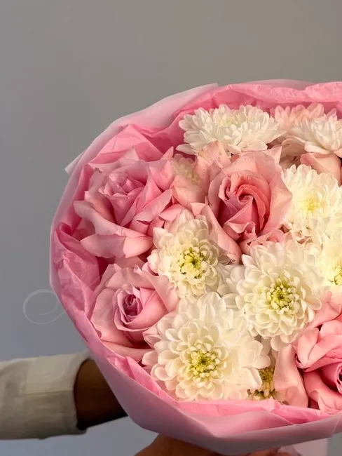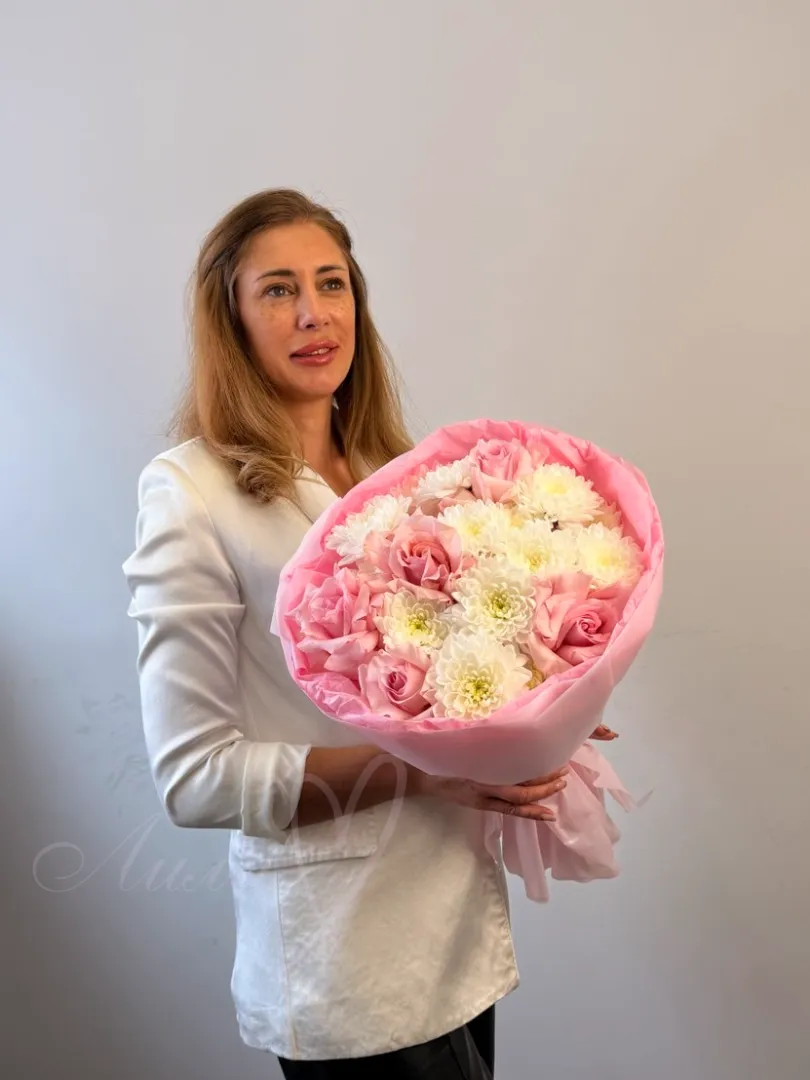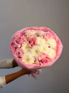 Этот букет изящно сочетает в себе нежные розы, изящный лизиантус, ароматные гвоздики, декоративные колосья. Все компоненты букета красиво дополняют друг друга, создавая утонченный и стильный образ. Упакованный в элегантную упаковку, этот букет станет прекрасным подарком для любого повода.
