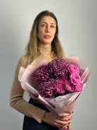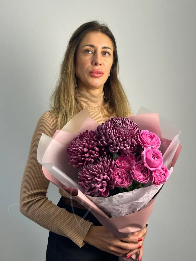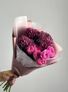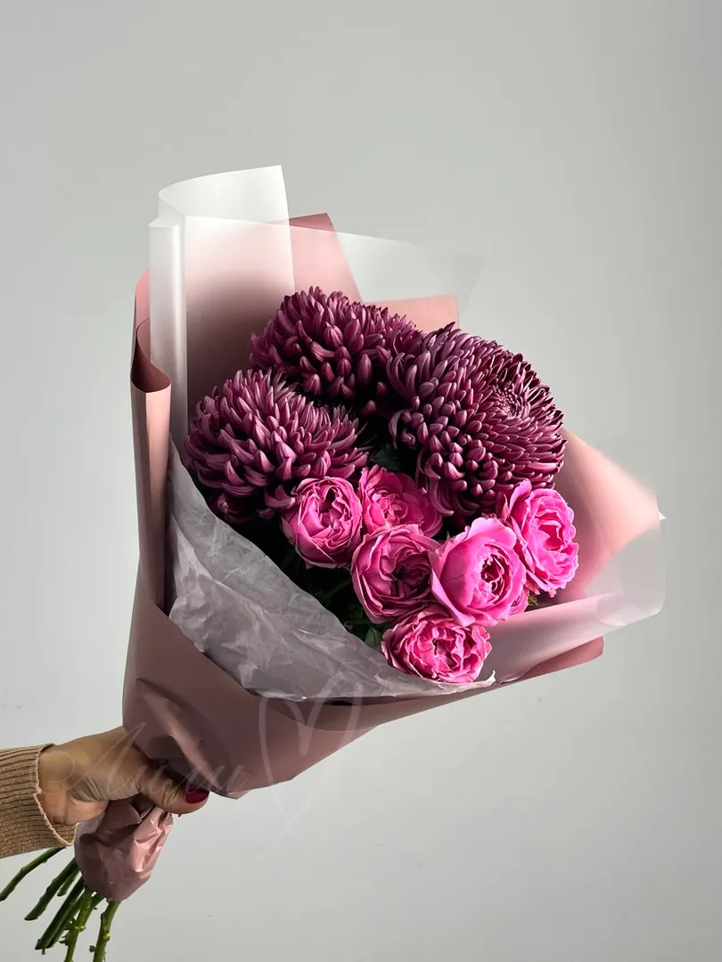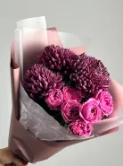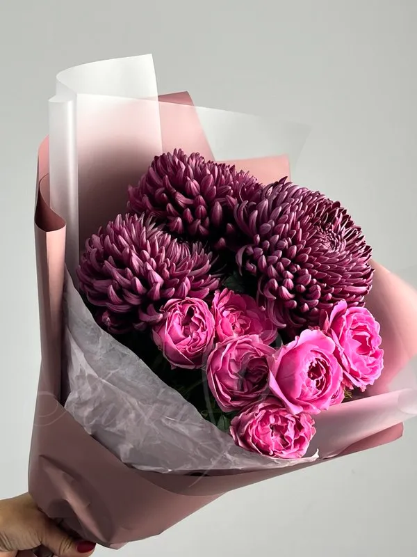 Этот изысканный букет из ярких хризантем и нежных роз, красиво упакованный в упаковку, станет прекрасным подарком для особого человека в вашей жизни.