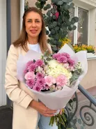 Яркий сборный букет с шикарными хризантемами.