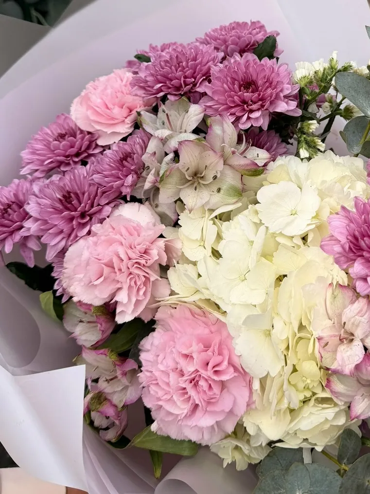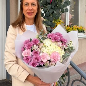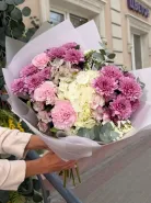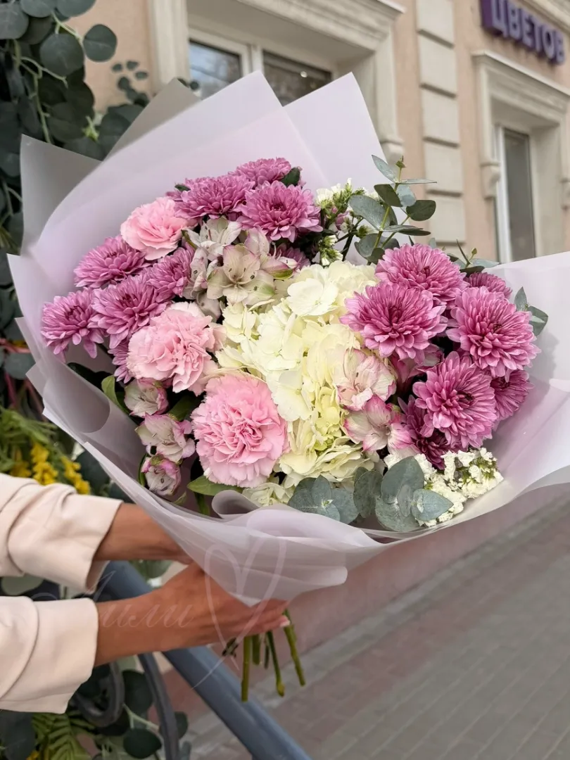 Сборный букет из гортензии, хризантем и гвоздик «Невинный поцелуй»