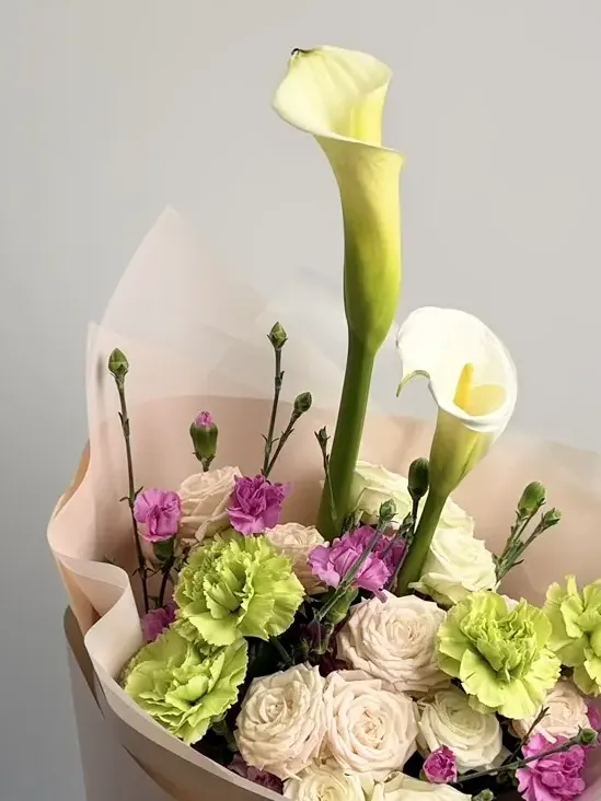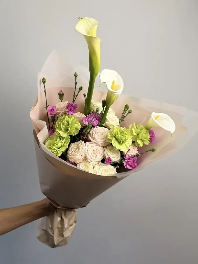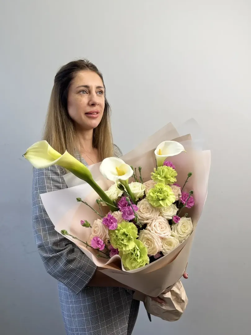 Букет из калл, гвоздик и роз «Кусочек лайма»