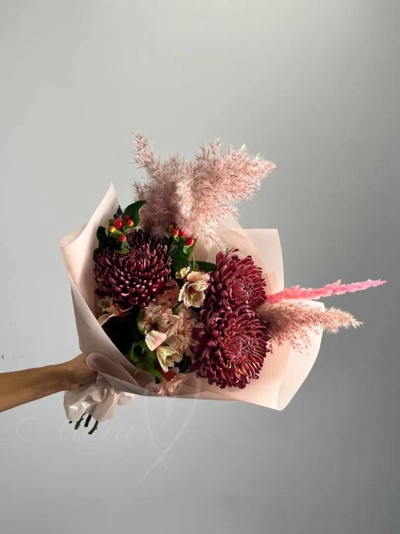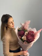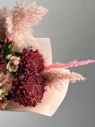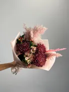 Сборный букет их хризантемы, гвоздики и альстромерии с добавлением сухоцветов.