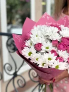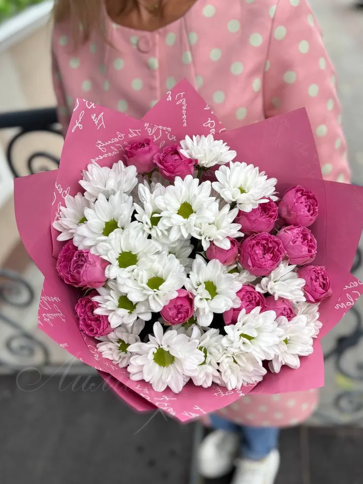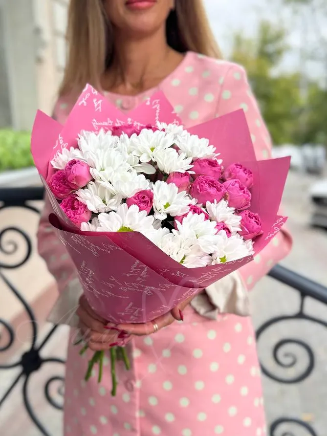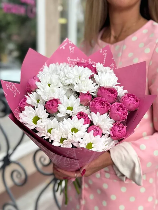 Этот утонченный букет состоит из пионовидных роз и хризантем, которые символизируют любовь и нежность. Каждый цветок олицетворяет уважение и восхищение, делая этот букет идеальным подарком для особых моментов в жизни. Благородная упаковка из корейской бумаги добавляет элегантности и завершённости этому прекрасному букету.