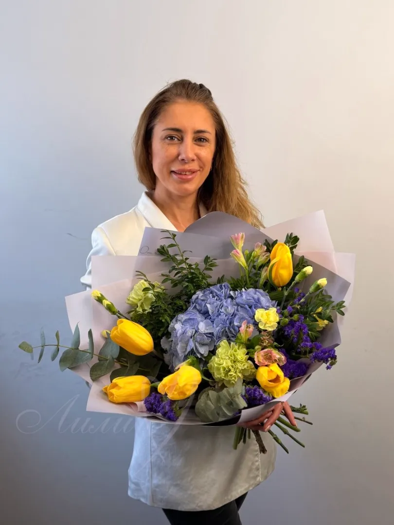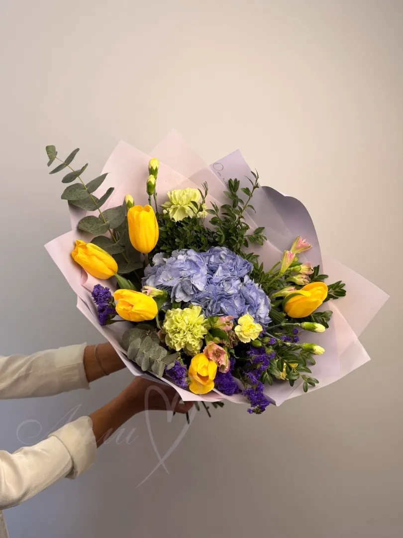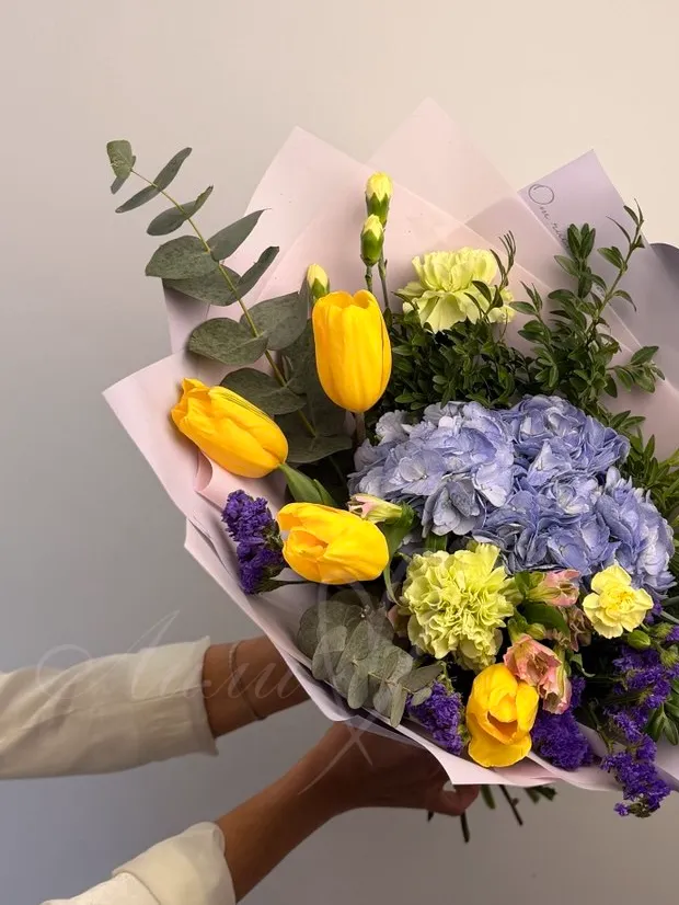 Изысканное сочетание ярких и нежных цветов. В его состав входят гортензия, тюльпан, статиса, гвоздика и кустовая гвоздика, которые создают насыщенную палитру оттенков и текстур. Альстромерия и эвкалипт добавляют воздушности и свежести композиции, а зеленые листья подчеркивают её естественную красоту.