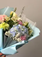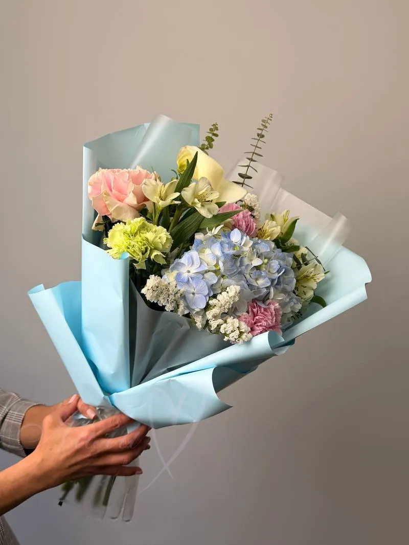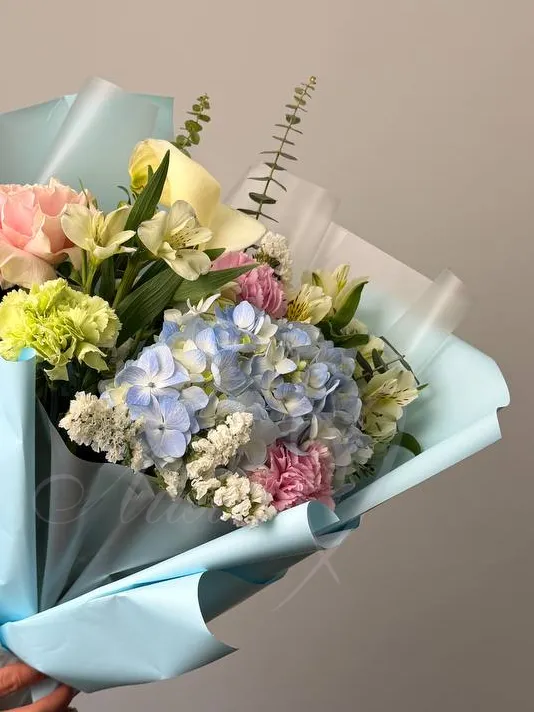 Представляем вам букет «Санрайз» – настоящее воплощение солнечного настроения и изысканности. В его основе – пышная гортензия, словно облако нежности, окруженное утонченными каллами. Французская роза добавляет букету романтики и благородства, а невесомая статица придает воздушности. Зелень эвкалипта окутывает композицию свежестью и элегантностью, а яркая альстромерия и нежная гвоздика создают удивительную игру красок. Каждый цветок в этом букете подобран с особой тщательностью, чтобы создать гармоничный и запоминающийся образ. Букет «Санрайз» – идеальный подарок, который вызовет искренние эмоции и оставит теплые воспоминания. Он прекрасно подойдет для любого торжества, будь то день рождения, юбилей или просто желание сделать приятное близкому человеку. Элегантная упаковка подчеркнет красоту цветов и добавит завершающий штрих. Подарите солнечный свет и красоту с букетом «Санрайз»!