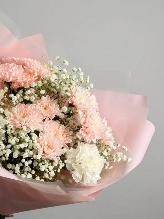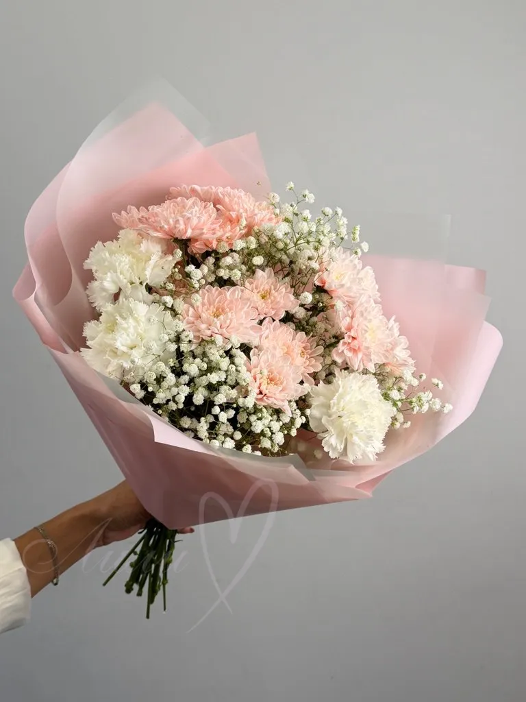 Этот изящный букет из нежных хризантем и гвоздик станет прекрасным подарком для ценителей красоты и изысканности.