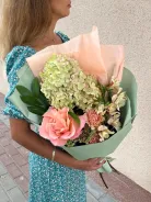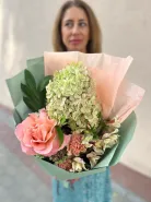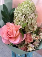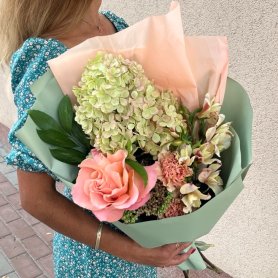 На фото букет из гортензии и прекрасной французской розы, необычного цвета будут долго радовать вас своей стойкостью