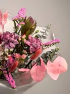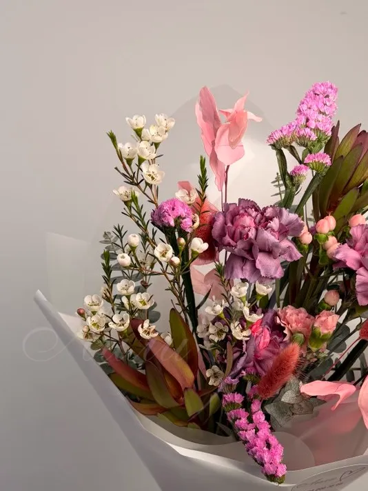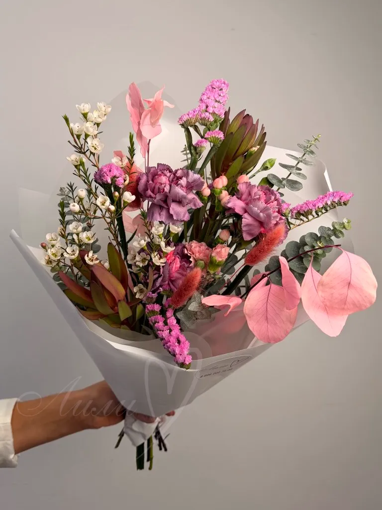 Букет «Весенняя свежесть» сочетает яркие и нежные оттенки, создавая атмосферу пробуждения природы. В его составе — хамелациум и леукадендрон, добавляющие легкости и воздушности. Сухоцвет, эвкалипт и статица придают букету текстуру и аромат, а гвоздика создает насыщенность и глубину. Оканчивает композицию аккуратная упаковка, подчеркивающая изысканность подарка.