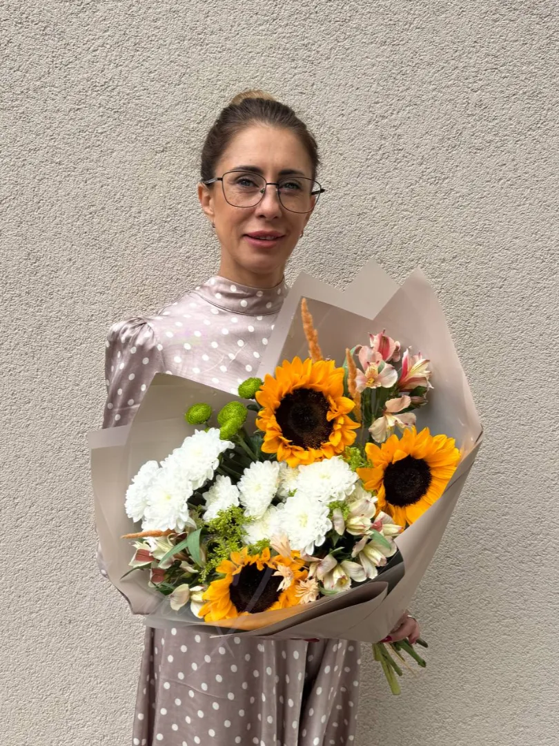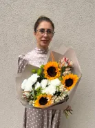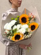Яркий и красивый букет из Шикарных подсолнухов ,альстромерии и другими цветами - это отличный выбор для подарка близкому человеку. Эти нежные цветы в упаковке будут радовать глаз своими яркими оттенками и приятным ароматом. Идеальный подарок для любого случая!