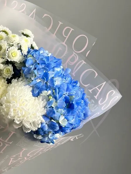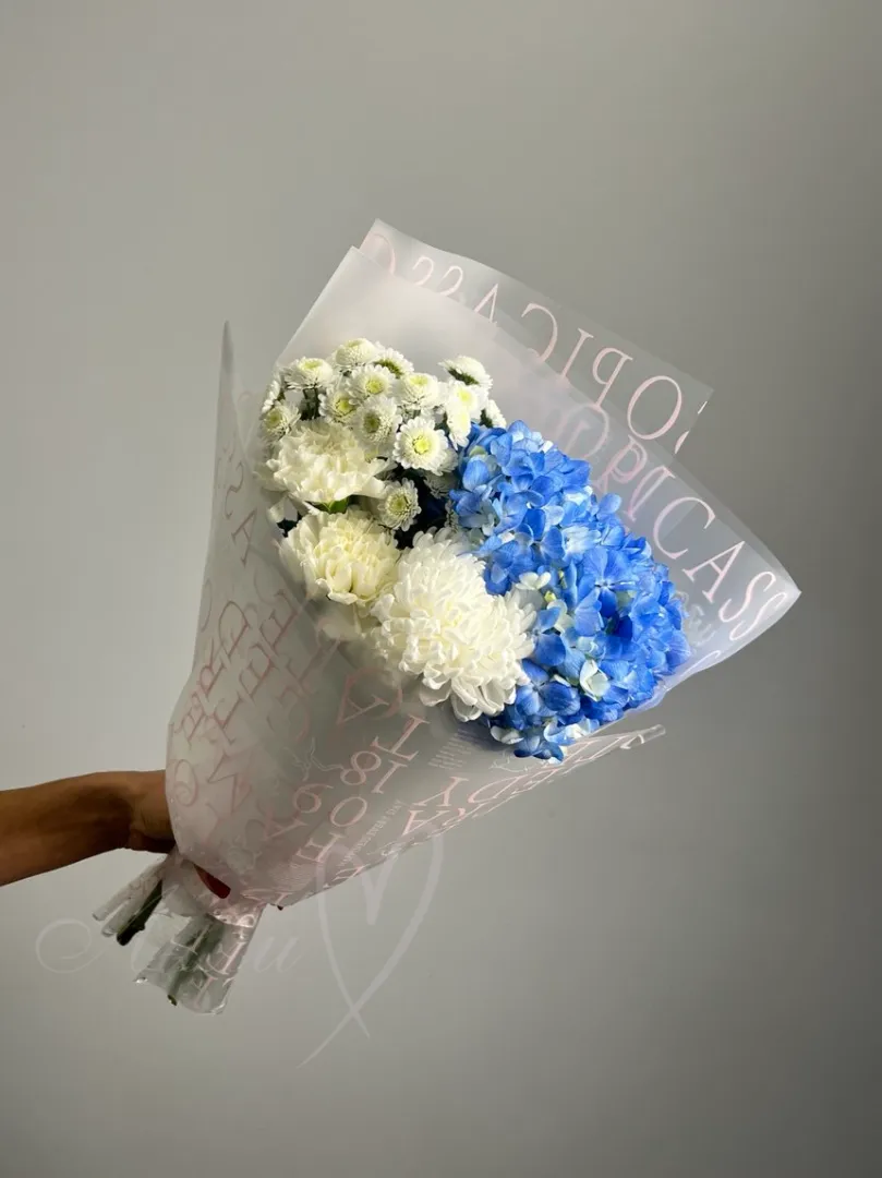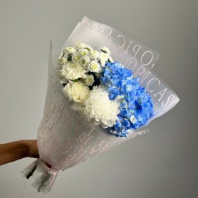 Сборный букет из гортензии, хризантемы и гвоздики.