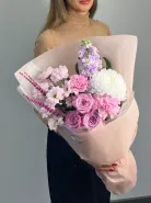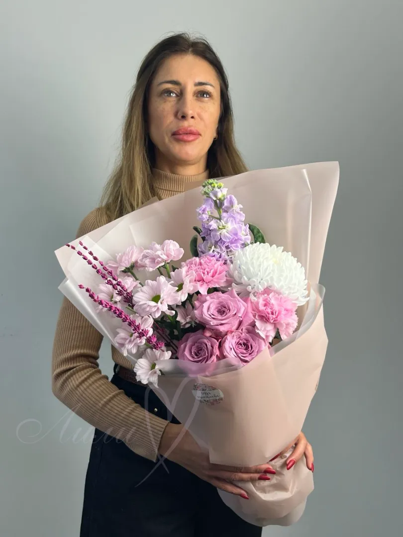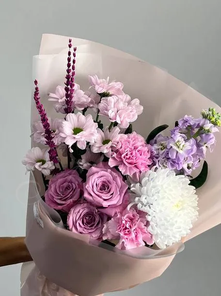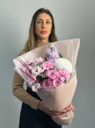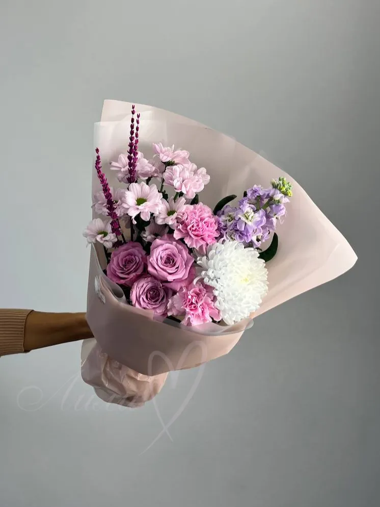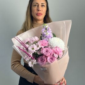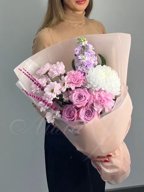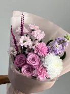 Красочный букет из хризантемы, роз и маттиолы, упакованный в красивую корейскую бумагу, станет украшением любого интерьера и прекрасным подарком для близких и дорогих людей.
