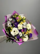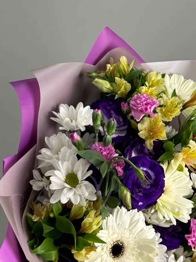 Сборный букет из герберы, альстромерии, эустомы и хризантемы кустовой.