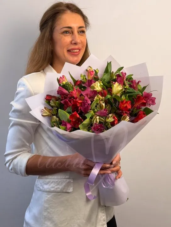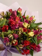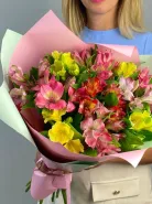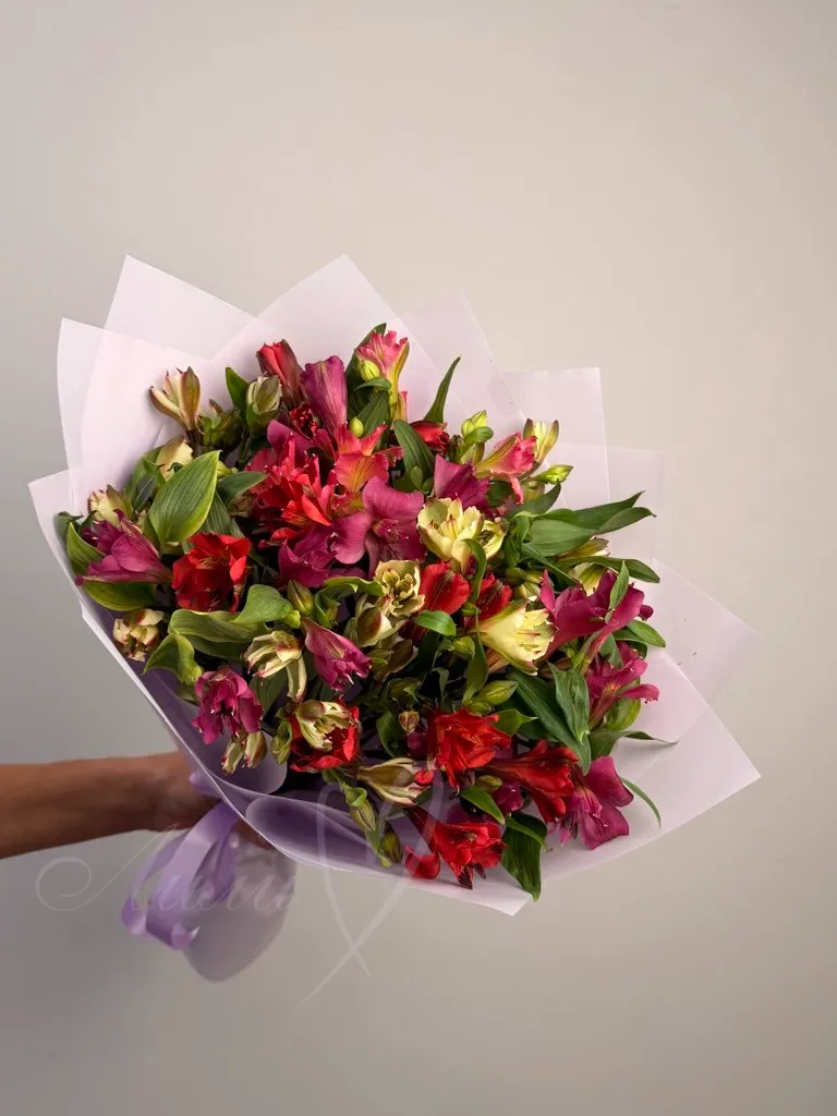 Яркий и стильный букет с изумительными альстромериями, который выделится среди других букетов. Он оформлен в элегантной упаковке из корейской бумаги, которая придает ему особую изысканность. Идеальное сочетание красоты и оригинальности для особенного повода.