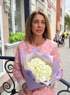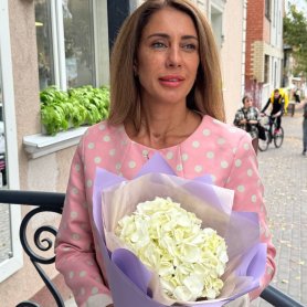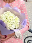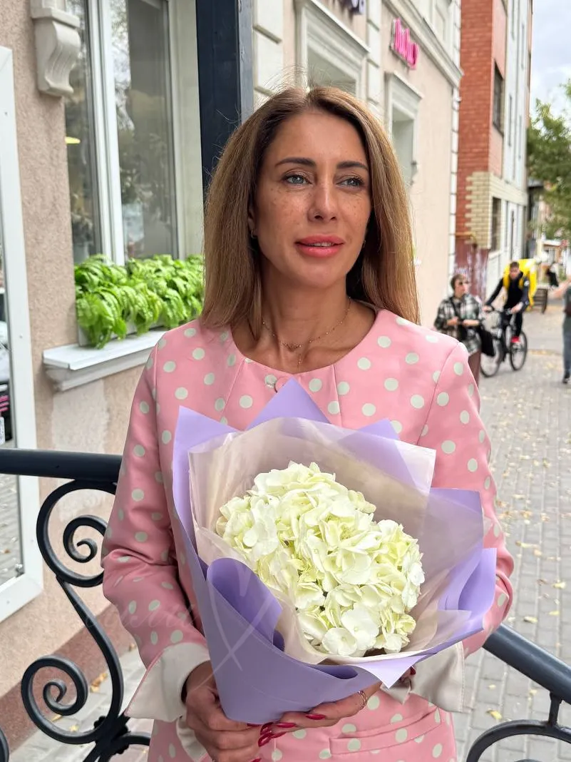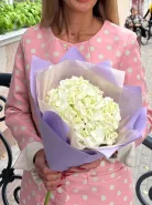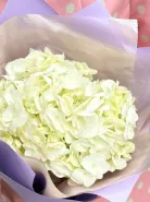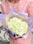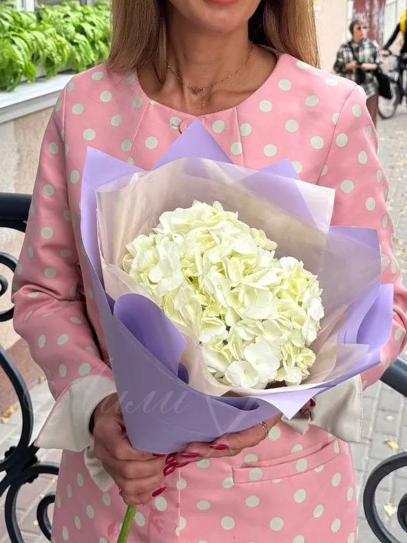 Белоснежная шапка из белой гортензии в корейской упаковке.