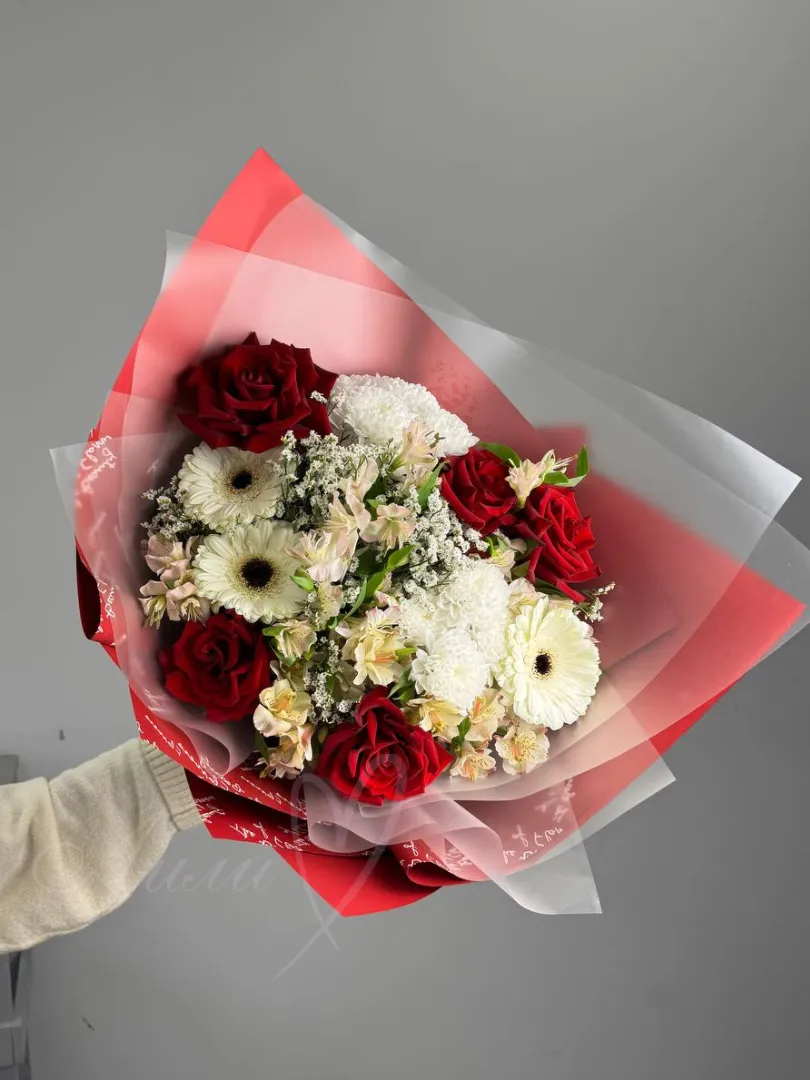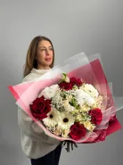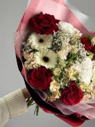 Сборный букет в состав которого входят прекрасные розы, гербера и хризантемы, который приносит в дом аромат свежести.