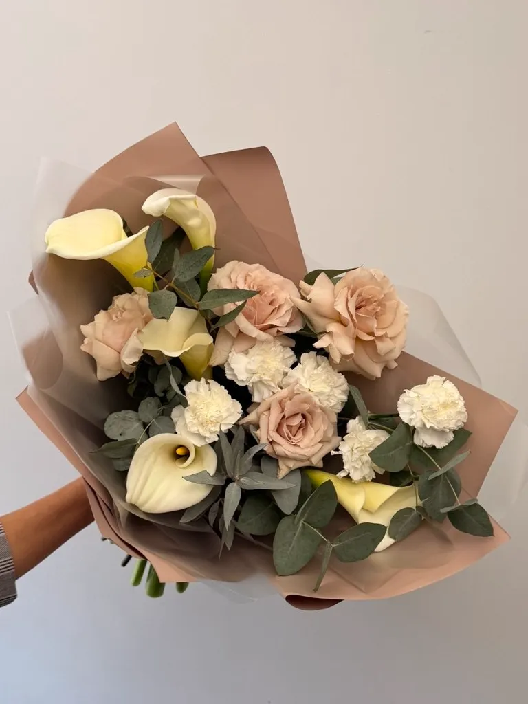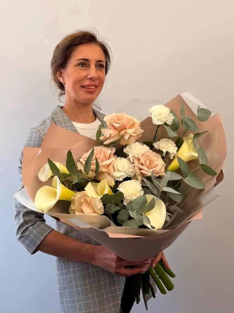 Букет из французских роз, калл и гвоздик «Райские грезы»