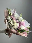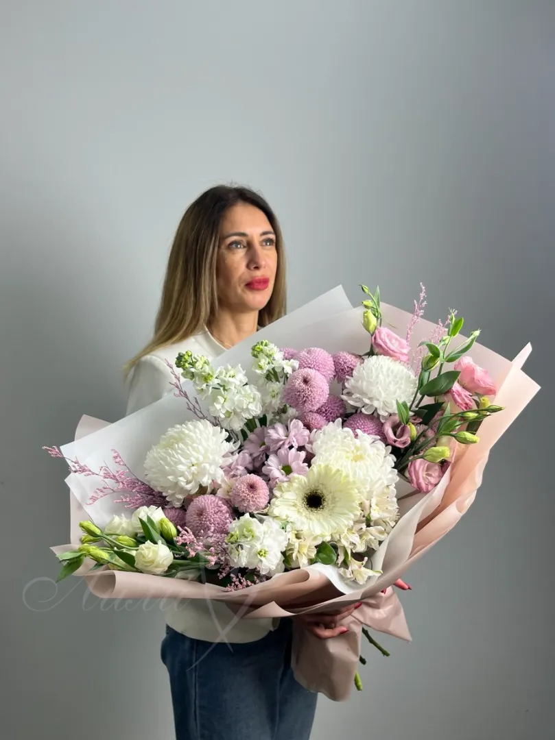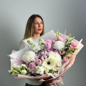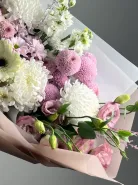 Сборный,объемный букет с маттиолой, эустомой, хризантемой и кустовой хризантемой - точно обрадует получателя.