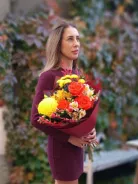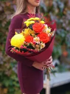 Яркий осенний букет с розой, хризантемой и альстромерией.