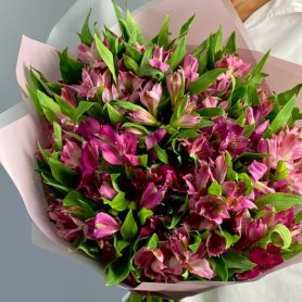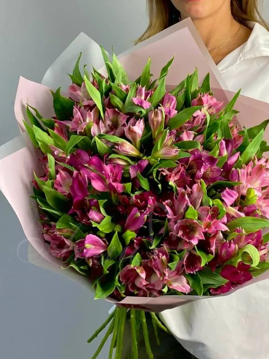 Хорошо подобранный цвет альстромерии в сочетании с зелеными листочками придает букету ощущение легкого живого куста в упаковке!