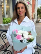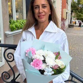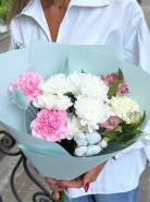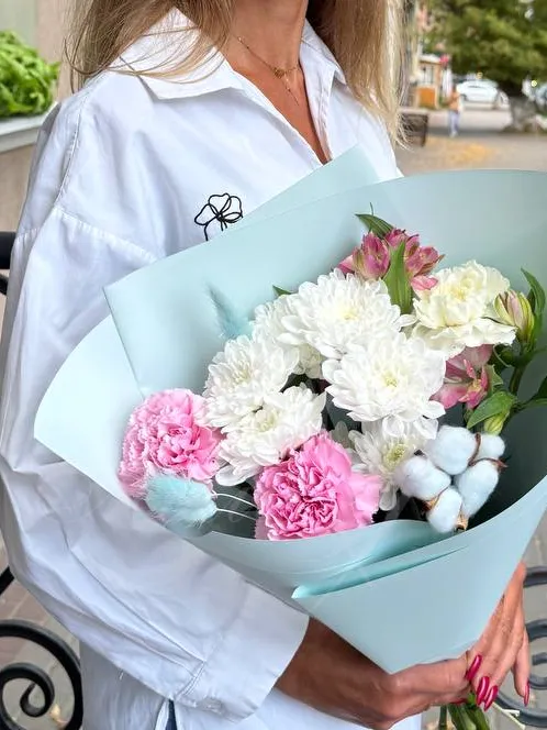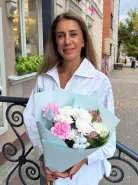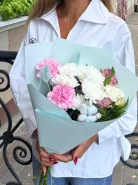 Нежные цветы-хризантема,альстромерия,гвоздика, наполнят ваш день вдохновением и радостью. Этот букет погружает в атмосферу лета и солнечного настроения.