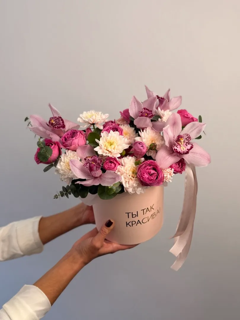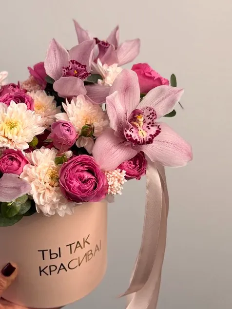 Элегантное сочетание нежных оттенков и изысканных растений. В его состав входят орхидея, создающая изысканный и романтичный акцент, а также кустовая хризантема и кустовая роза, добавляющие объем и насыщенность.