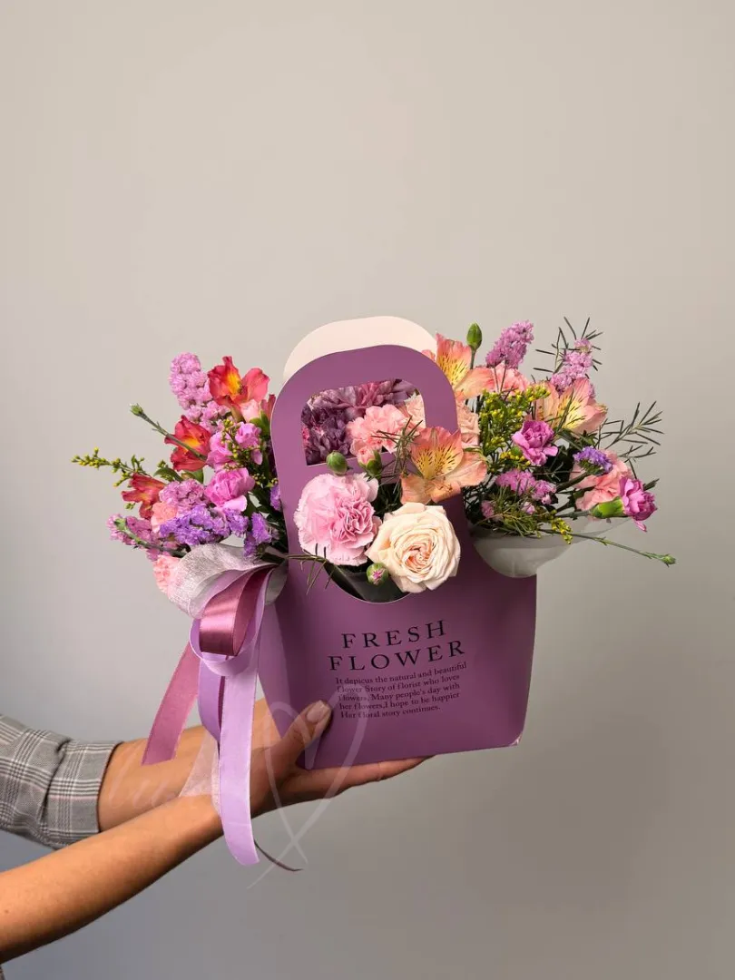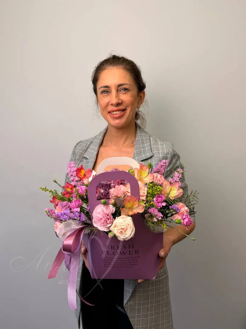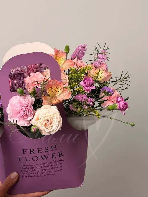 Представляем вашему вниманию очаровательный букет «Анита», созданный с любовью и вниманием к деталям. Это гармоничное сочетание нежных гвоздик и яркой альстромерии, символизирующих восхищение и преданность. Неприхотливый солидаго добавляет легкости и воздушности, создавая неповторимый весенний акцент. Пышная зелень придает композиции завершенный и естественный вид. Кустовая гвоздика вносит объем и разнообразие, подчеркивая красоту каждого цветка. Добавление пиафлора придает букету утонченность и изысканность. Стильное кашпо завершает образ, делая букет готовым подарком, который украсит любой интерьер. «Анита» - это прекрасный способ выразить свои чувства и подарить незабываемые эмоции.