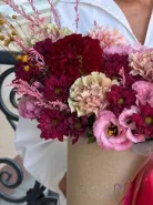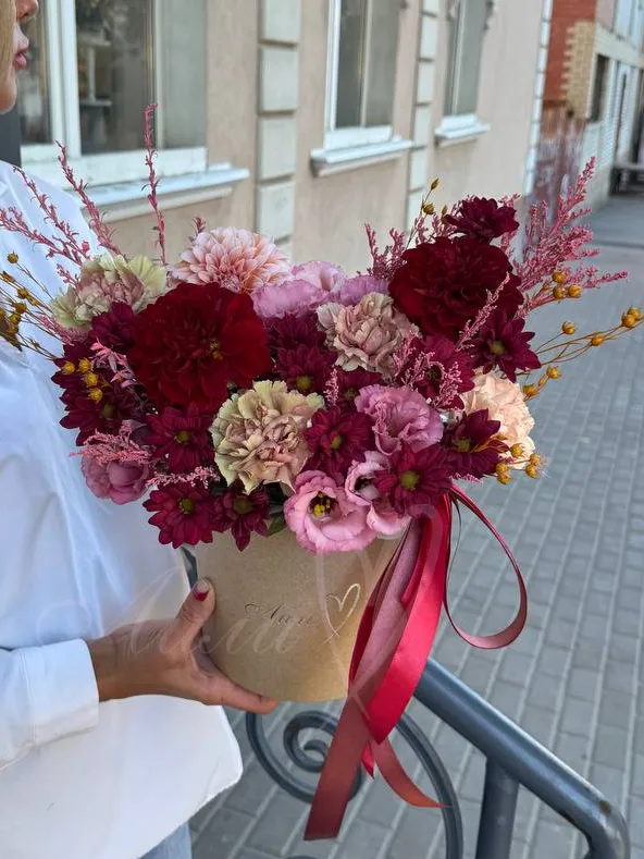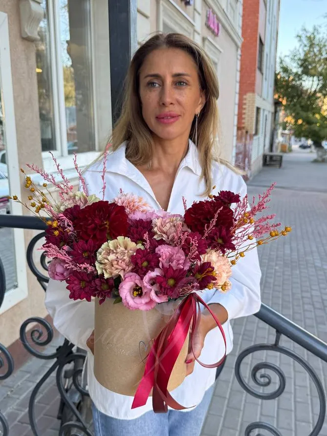 Эта осенняя композиция с георгином, наполненная свежими цветами, словно дыхание природы, радует глаз и поднимает настроение.
