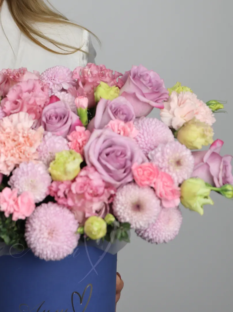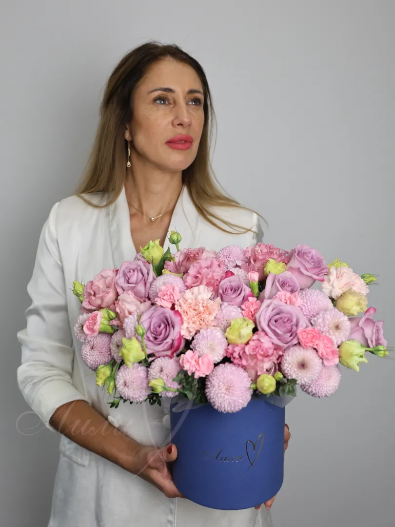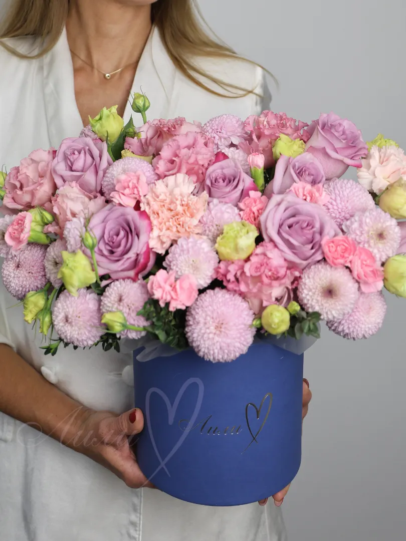 Шляпная коробка с потрясающими розами и кустовой хризантемой.