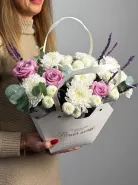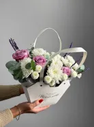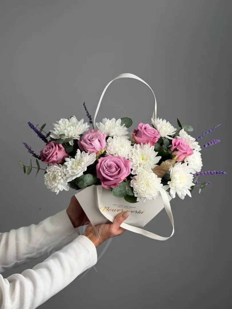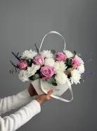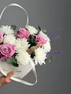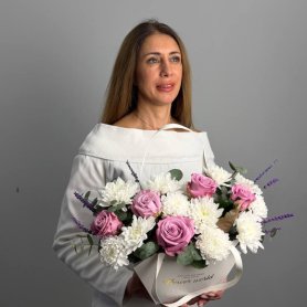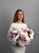 Нежная композиция из роз и хризантем, подойдет к любому поводу. Она зарядит солнечной энергией на весь день любимых и напомнит о вашей сильной любви.