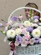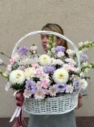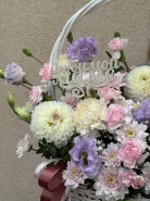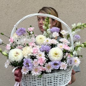 Прекрасная композиция в корзине в сочетание с георгином, хризантемой и эустомой.