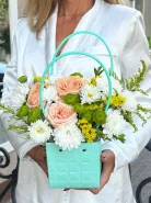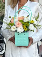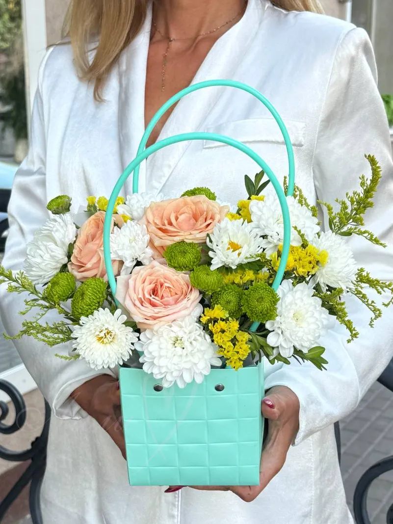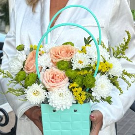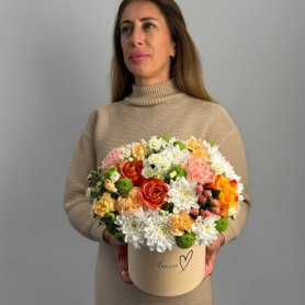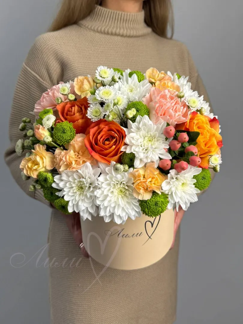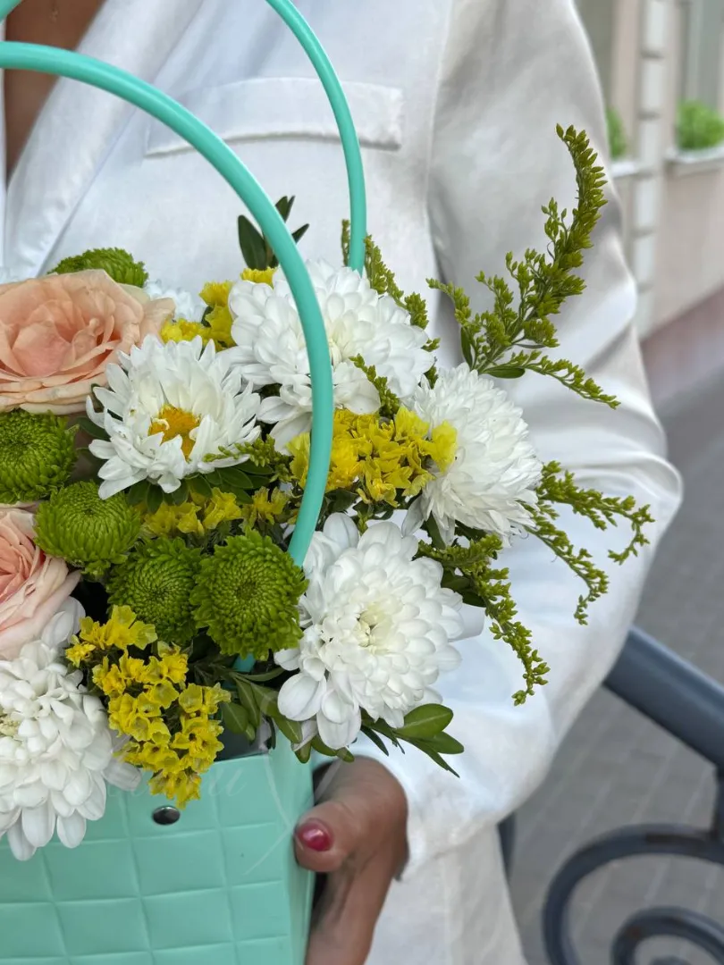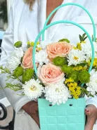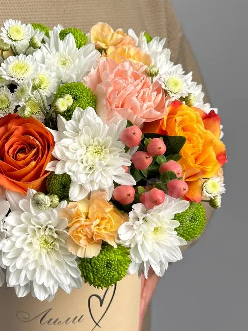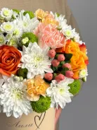 Прекрасная композиция из роз,хризантем с добавление зелени.