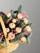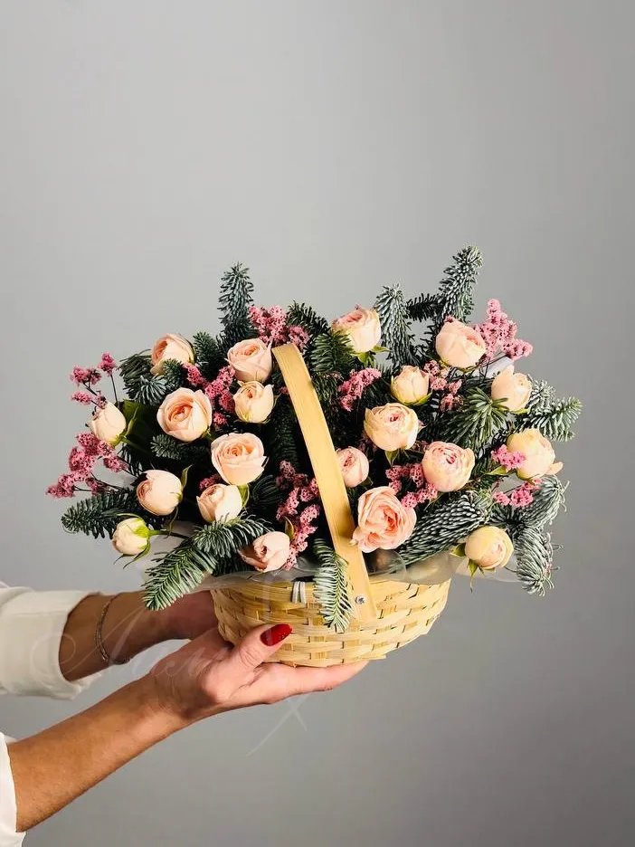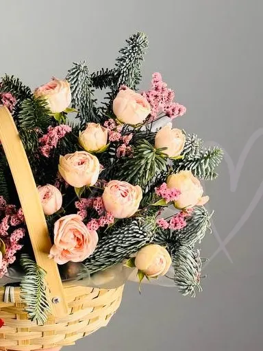 Нежные лепестки кустовой розы и изысканный блеск нобилиса, создавая ощущение лёгкости и радости. Лимониум добавляет свежести и солнечного настроения, освежая композицию яркими акцентами.