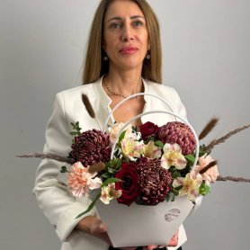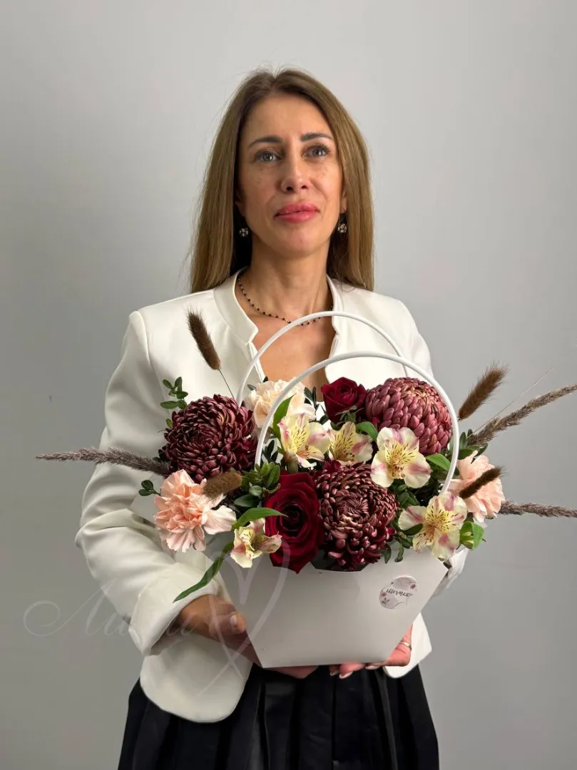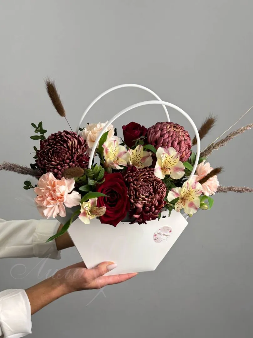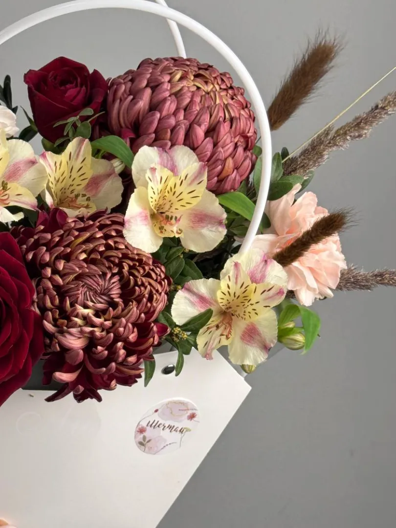 Цветочная композиция из хризантемы, роз и альстромерии станет прекрасным дополнением к любому подарку, подчеркивая вашу заботу и внимание.