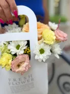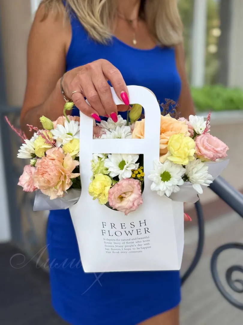 Этот букет яркий и стильный. Каждый цветок добавляет особое очарование этой композиции. Букет упакован в элегантную сумочку, что делает его отличным подарком для любого случая.