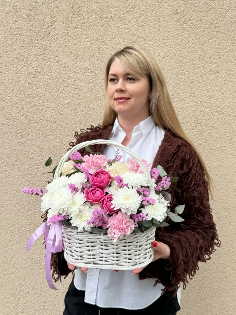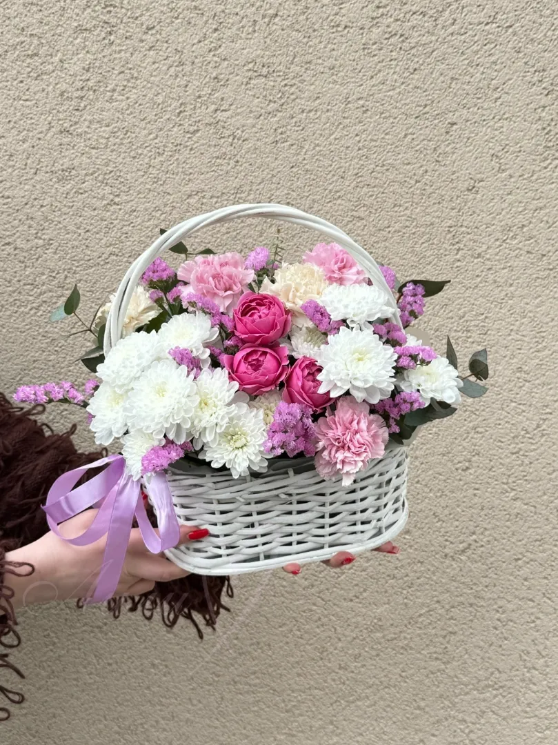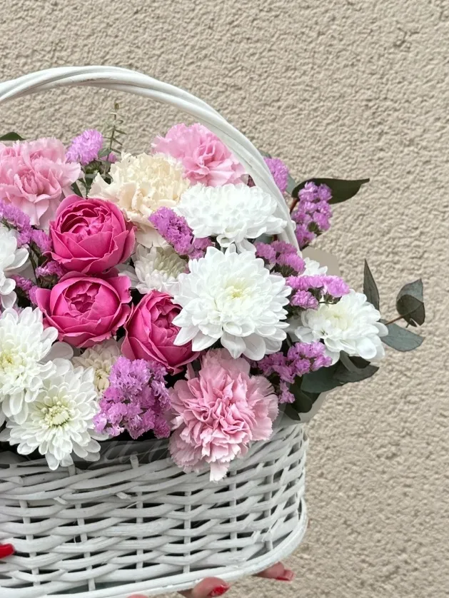 Букет «Илинка» – это гармоничное сочетание нежности и изящества, призванное подарить радость и тепло. Сердце композиции составляют пышные кустовые хризантемы, наполняющие ее объем и богатство оттенков. Рядом с ними распускаются бархатистые гвоздики, добавляющие букету нотку классической элегантности и утонченности. Нежные кустовые розы вносят в композицию романтическое настроение и подчеркивают ее утонченный стиль. Воздушная статица, словно невесомые облачка, придает букету воздушность и легкость. Изысканный эвкалипт добавляет освежающую зелень и тонкий аромат, завершая образ. Пиафлор, как драгоценный акцент, привносит в композицию особую прелесть и изюминку. Все это великолепие искусно собрано в стильную корзину, делая букет «Илинка» идеальным подарком для любого случая. Этот букет станет прекрасным символом вашего внимания и заботы, заставив улыбнуться даже самого искушенного ценителя красоты.