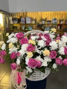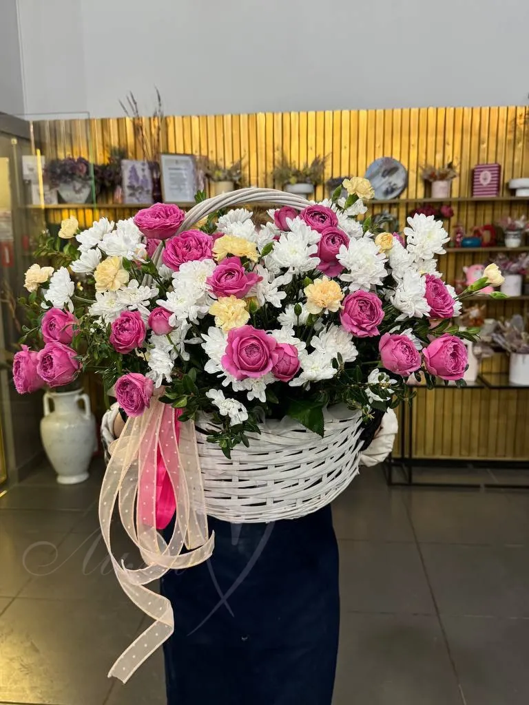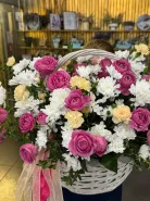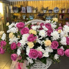 Очаровательная композиция из кустовой пионовидной розы,хризантем и гвоздик,которая создает атмосферу волшебства. Она приводит в восторг и оставляет незабываемые впечатления.