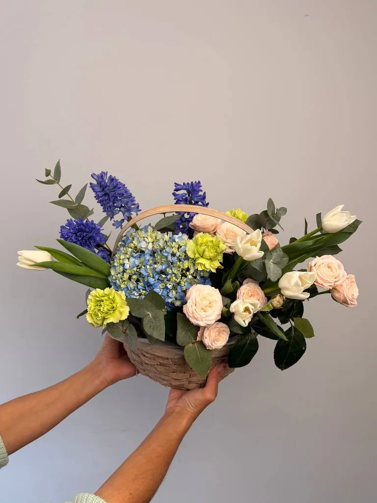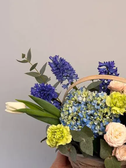Изящная композиция «Ангелина» — идеальный выбор для выражения любви и признательности. В букет входят нежная гортензия, яркие гиацинты, воздушные тюльпаны и кустовые розы, создающие насыщенную и гармоничную палитру. Необычные гвоздики добавляют романтический шарм и стойкость цветочной аранжировке. Эвкалипт придает композиции свежести и легкости, наполняя пространство приятным ароматом. Композиция отлично подойдет в качестве подарка на праздник или для украшения интерьера.