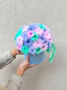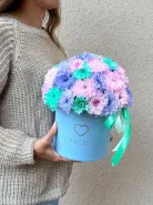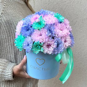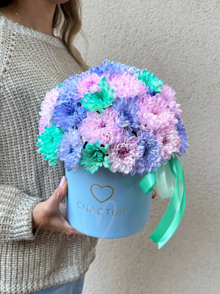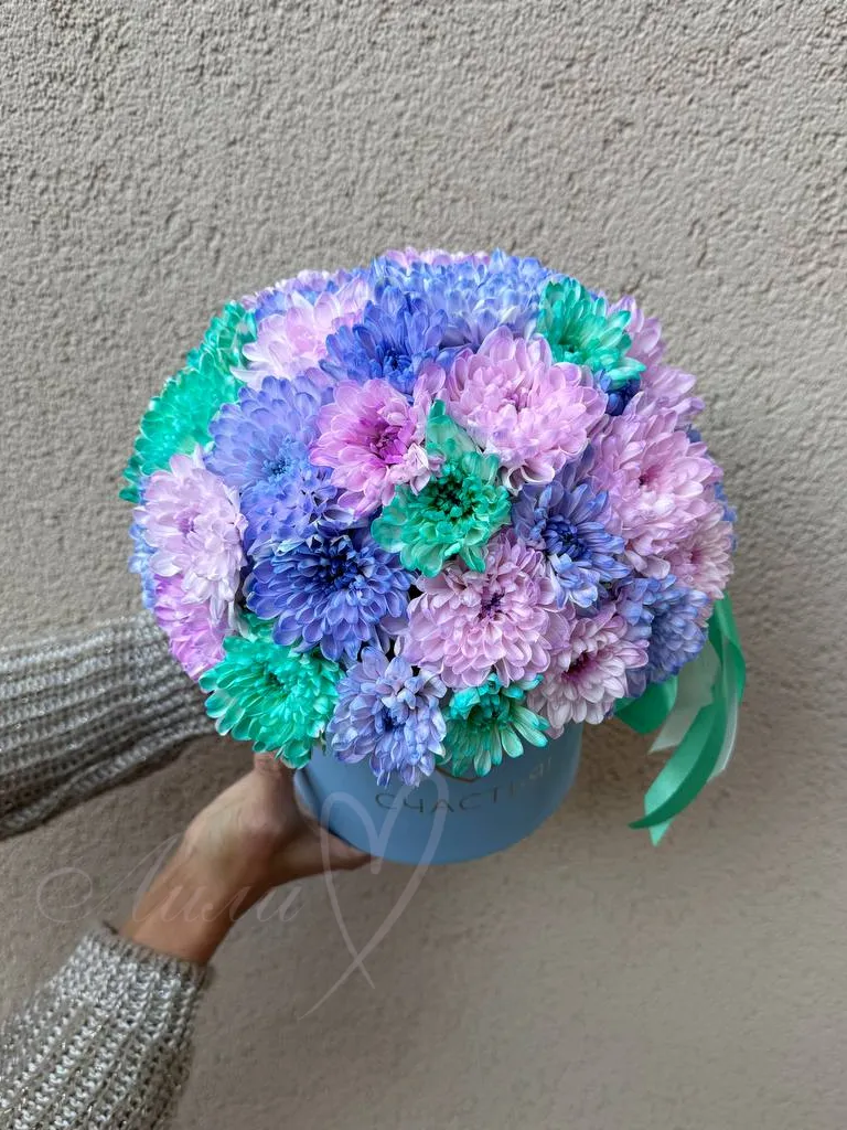 Нежная композиция из радужной хризантемы, подойдет для любого торжества.