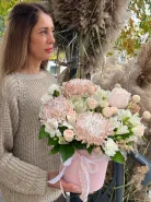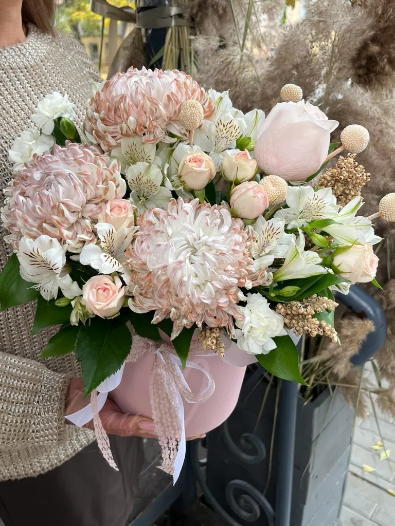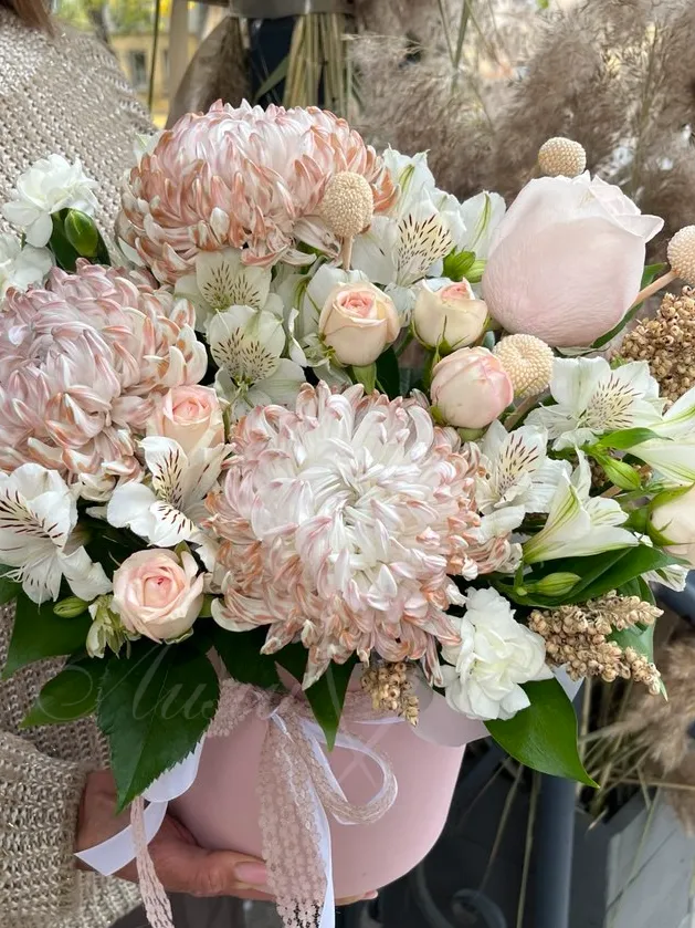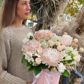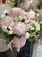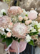 Композиция из нежно-розовых хризантем, гвоздикой и альстромерией.