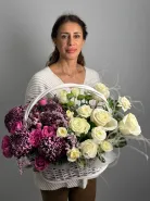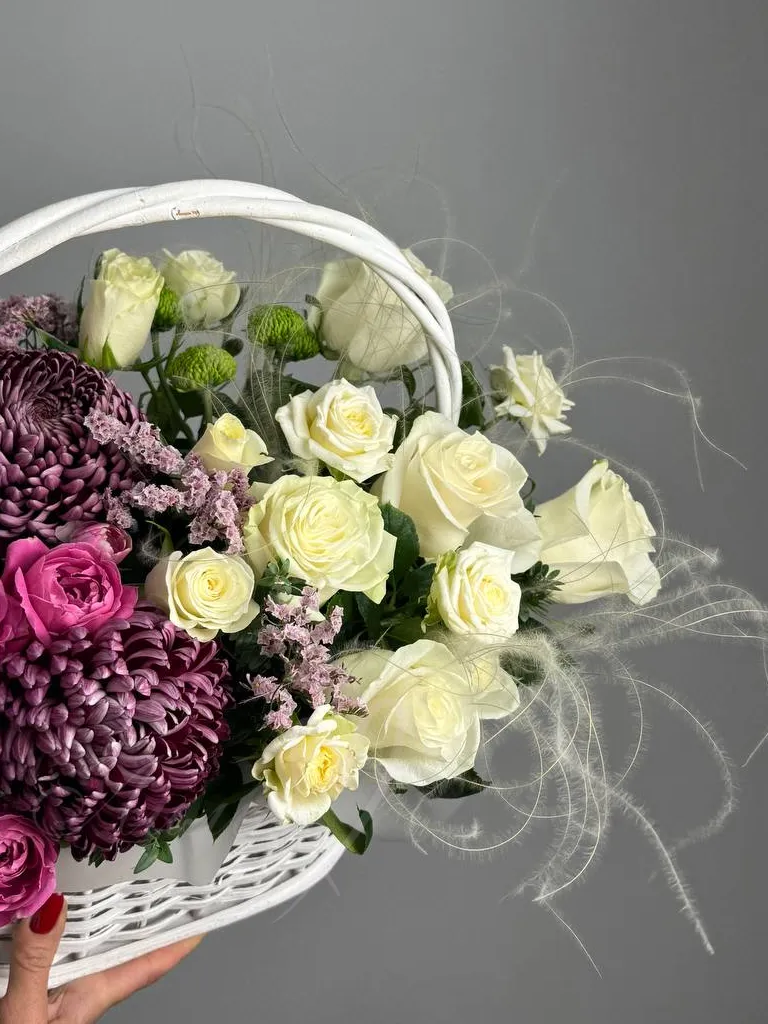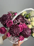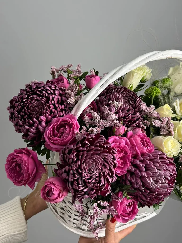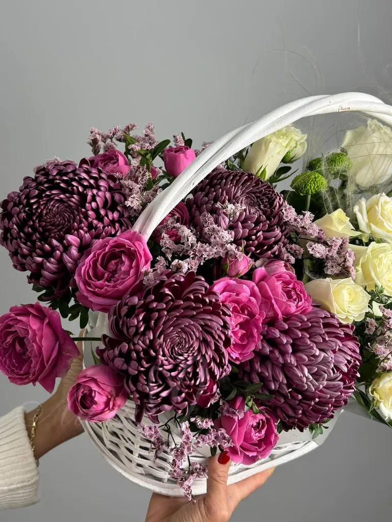 Букет-композиция «Взрыв чувства» — яркое и выразительное сочетание цветовых оттенков и текстур. В его состав входят розы, хризантемы, лимониум, аккуратно собранные в элегантную корзину. Этот цветочный подарок идеально подчеркнет сильные эмоции и создаст праздничное настроение.