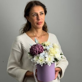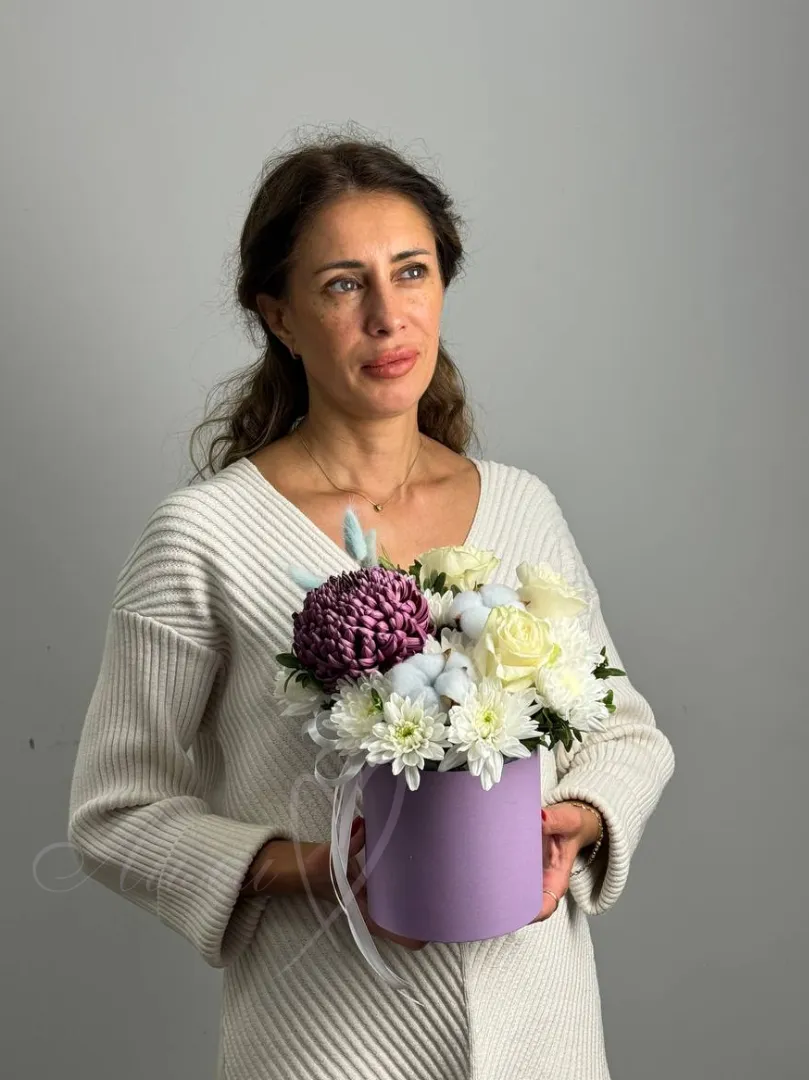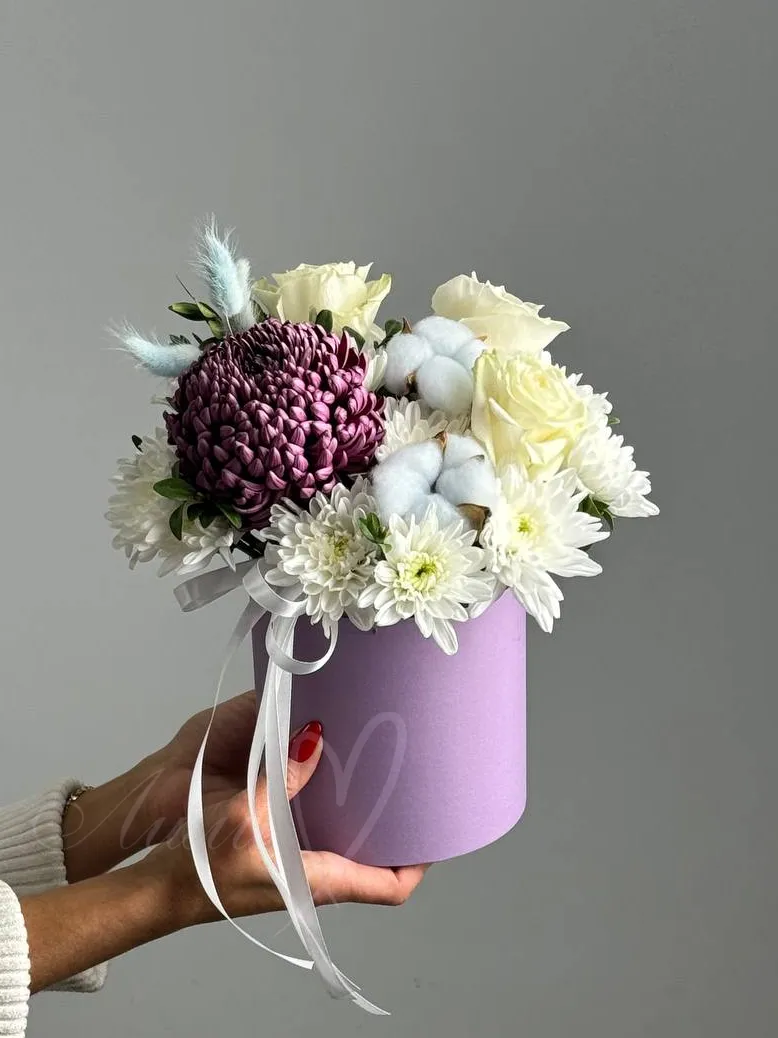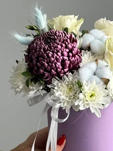 Этот элегантный букет состоит из роз, хризантем и хлопка. Он представлен в элегантной коробке, что делает его идеальным подарком для любого случая.