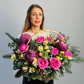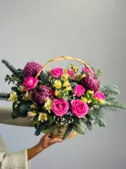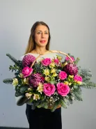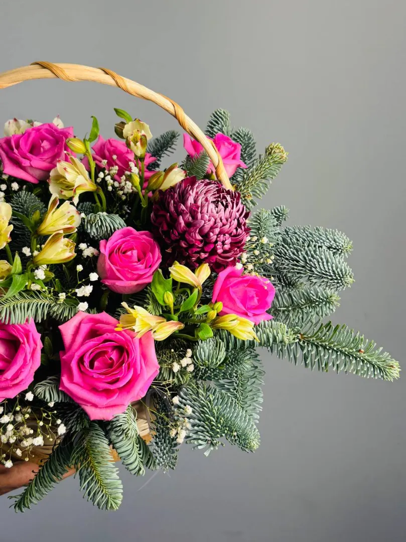 Этот элегантный букет состоит из роз, хризантем и альстромерии. Он представлен в элегантной корзине, что делает его идеальным подарком для любого случая.