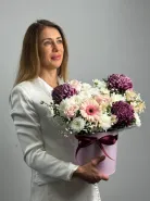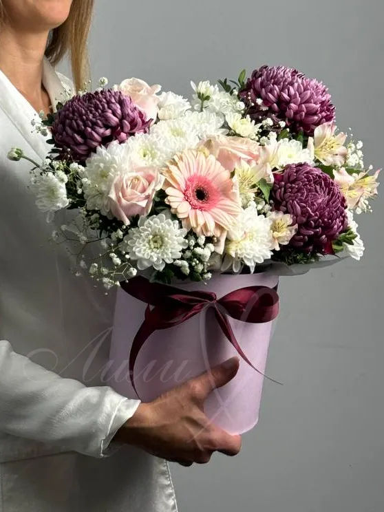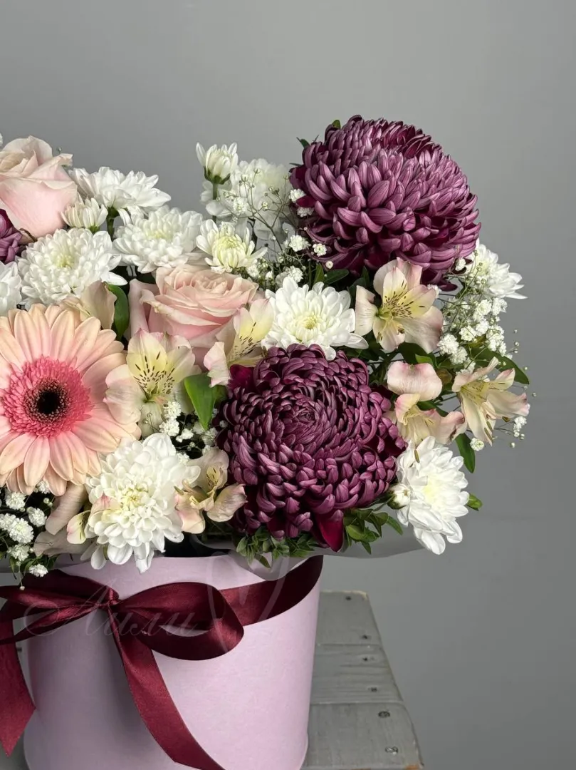 Изысканное сочетание ярких и нежных цветов, создающее ощущение гармонии и романтики. В её составе присутствуют хризантемы, розы, альстромерия и гипсофила в шляпной коробке. Эта композиция идеально подойдёт для особых случаев, чтобы выразить любовь, благодарность или поздравить близкого человека.