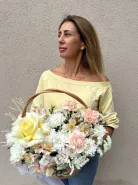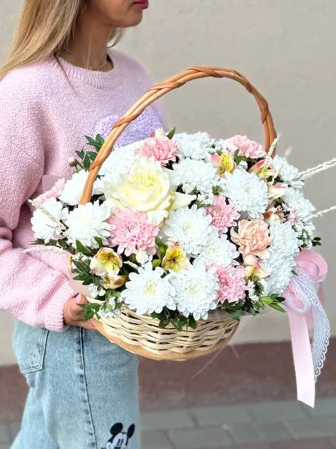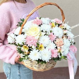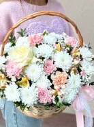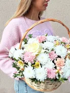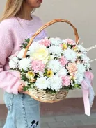 Букет в корзине с кустовыми хризантемами, французской розой и диантус- это изысканный подарок, который будет радовать своего получателя долгое время. Нежная палитра и сочные оттенки цветов создадут атмосферу праздника и радости. Этот букет подойдет для любого случая и станет прекрасным дополнением к вашим поздравлениям и пожеланиям.