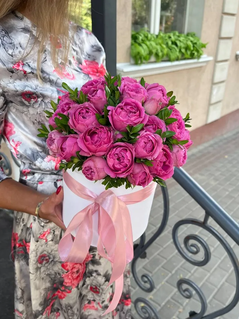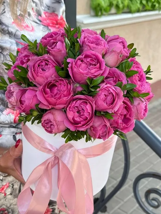 Композиция с яркими пионовидными розами, в шляпной коробке.