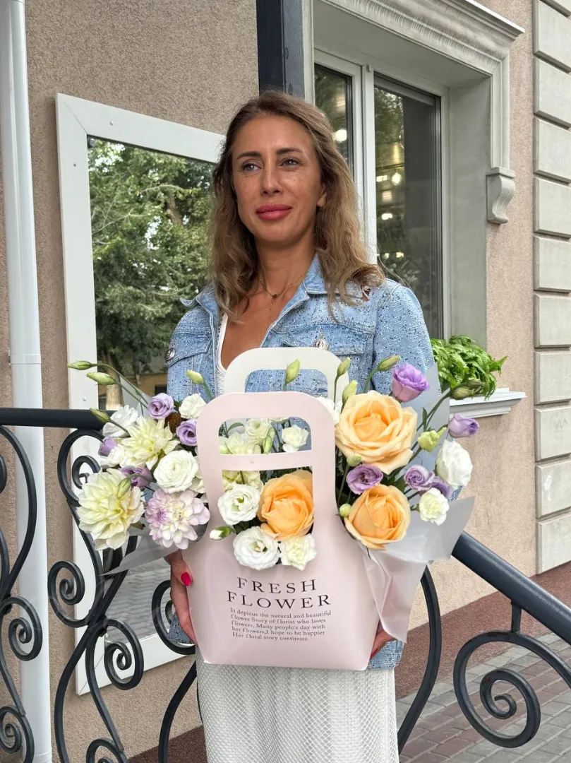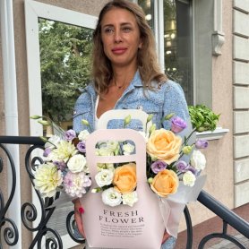 Этот великолепный букет собран из ярких роз, изящных лизиантусов и георгин, дополненных свежей зеленью. Он упакован в стильное кашпо- сумку. Этот букет станет прекрасным подарком для любого торжественного случая и порадует своей нежностью и красотой.
