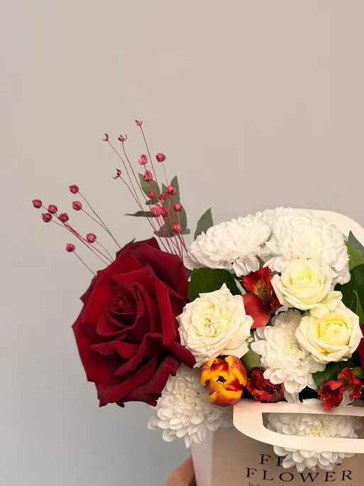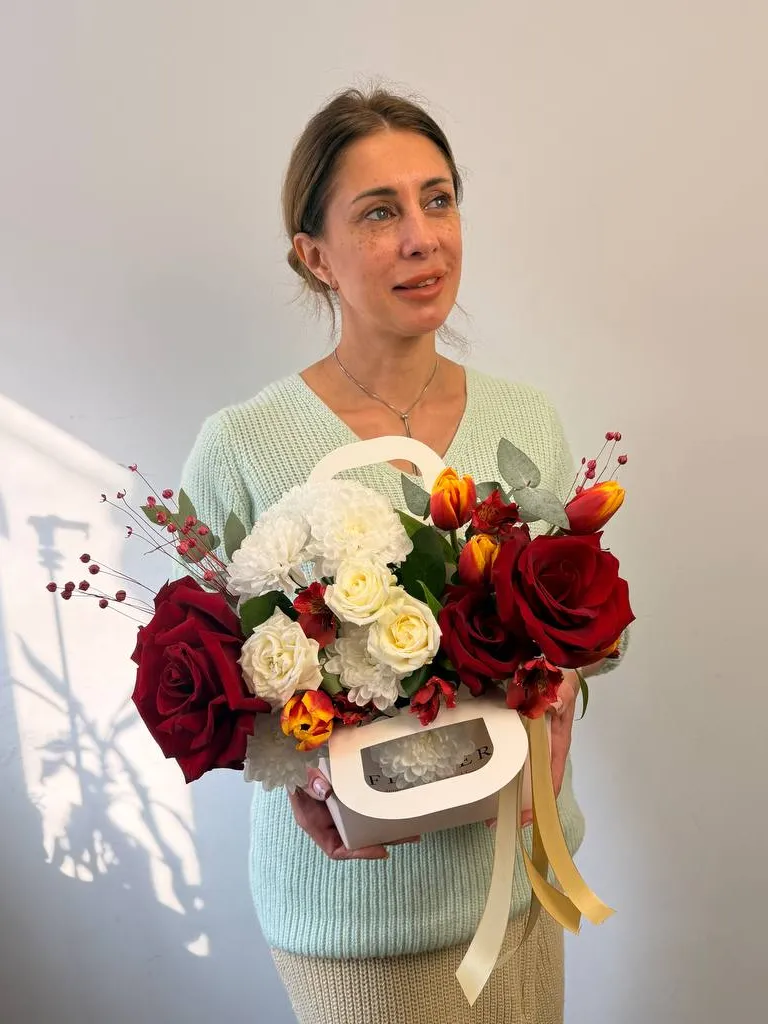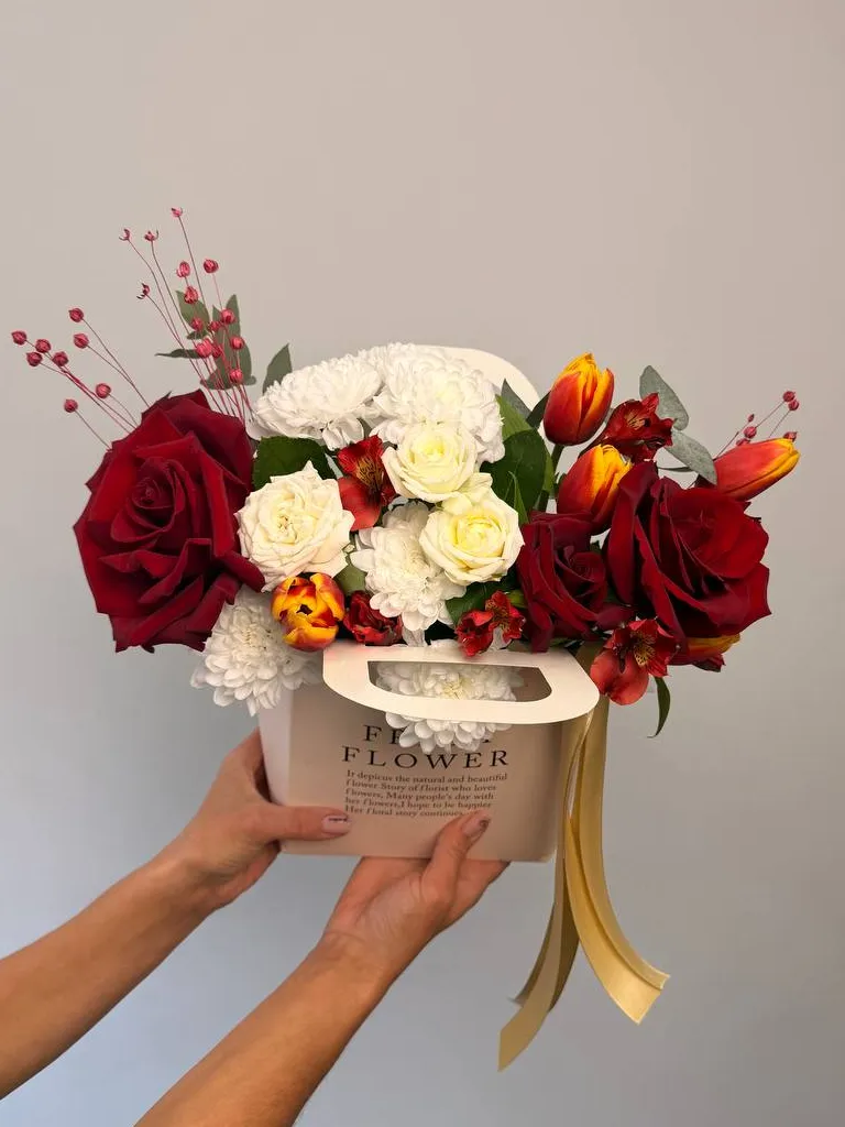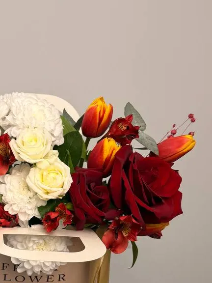 Подарите особенную атмосферу с композицией «Герда», которая объединяет изысканное сочетание роз из Эквадора, тюльпанов и хризантем. Элегантное оформление дополняют альстромерия, сухоцвет и эвкалипт, создавая гармоничную композицию. Стильный кашпо подчеркнёт утончённость подарка и станет его достойным украшением. Эта яркая и изящная цветочная композиция идеально подойдет для любого повода и оставит тёплый след в сердце получателя.